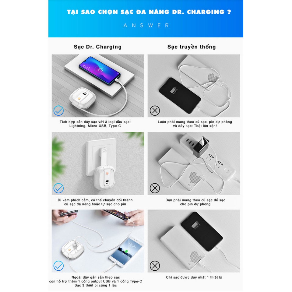 CỦ SẠC KIÊM PIN DỰ PHÒNG SẠC ĐA CỔNG DR. CHARGING: TÍCH HỢP THÔNG MINH, KẾT TINH GIÁ TRỊPhải mang đủ loại cáp sạc và sạc dự phòng theo mỗi khi ra ngoài với tín đồ công nghệ là "ác mộng"? Vậy thì hãy chấm dứt ngay cơn ác mộng này với CỦ SẠC KIÊM PIN DỰ PHÒNG SẠC ĐA CỔNG DR.CHARGING. Nhờ thiết kế nhỏ gọn, dây cáp cuộn vào trong thân sạc, vị trợ lý này gần như không hề tốn diện tích trong túi đồ của bạn mỗi khi ra đường. Hơn thế, nhờ đầu chuyển đổi lightning và Type-C cùng 3 cổng output cho phép sạc cùng lúc 3 thiết bị, chiếc sạc thông minh này tự tin đáp ứng hầu hết nhu cầu của người dùng hiện nay.