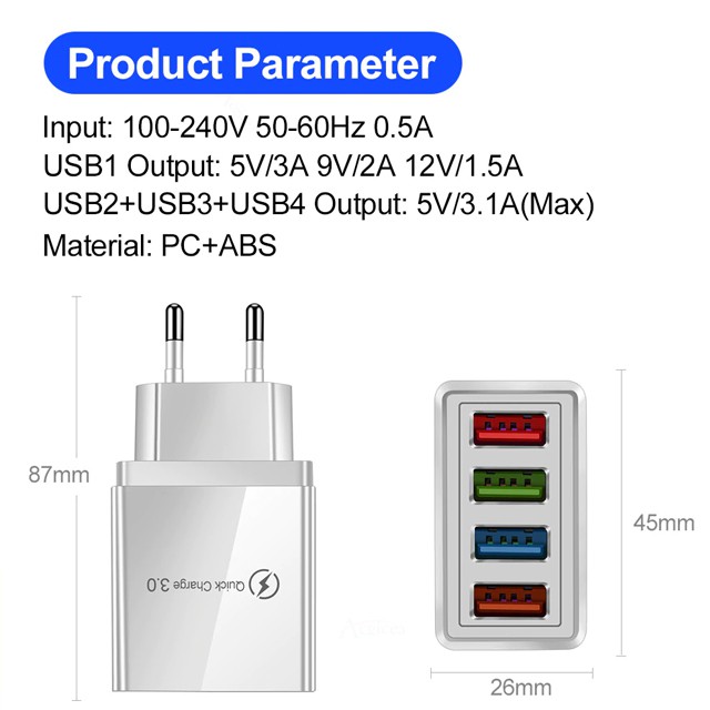 Phiên bản:- Màu đen , cam 3.1A: cho công suất sạc 4 đầu USB nhanh 3.1A (Không hỗ trợ Qualcomm )