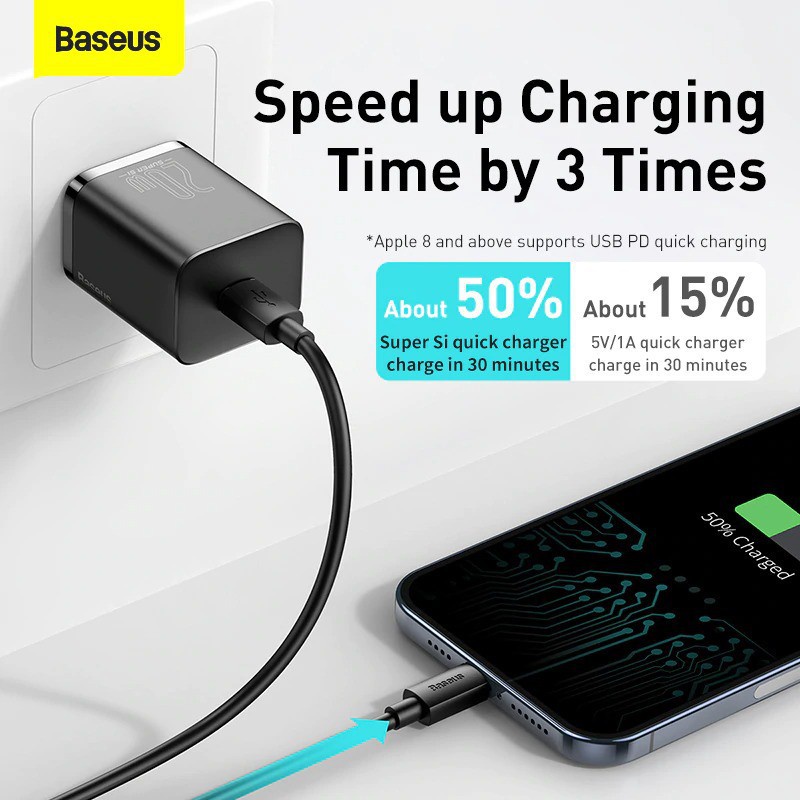 Củ sạc nhanh iPhone chính hãng Baseus Super Si hỗ trợ các dòng từ iphone 8 trở lên đều sạc nhanh iPhone PD 20w đầy 50% pin chỉ trong 30 phút, giúp tăng tốc thời gian sạc lên gấp 3 lần so với bộ sạc 5V / 1A.☑️ Vinhbaseus CAM KẾT :
