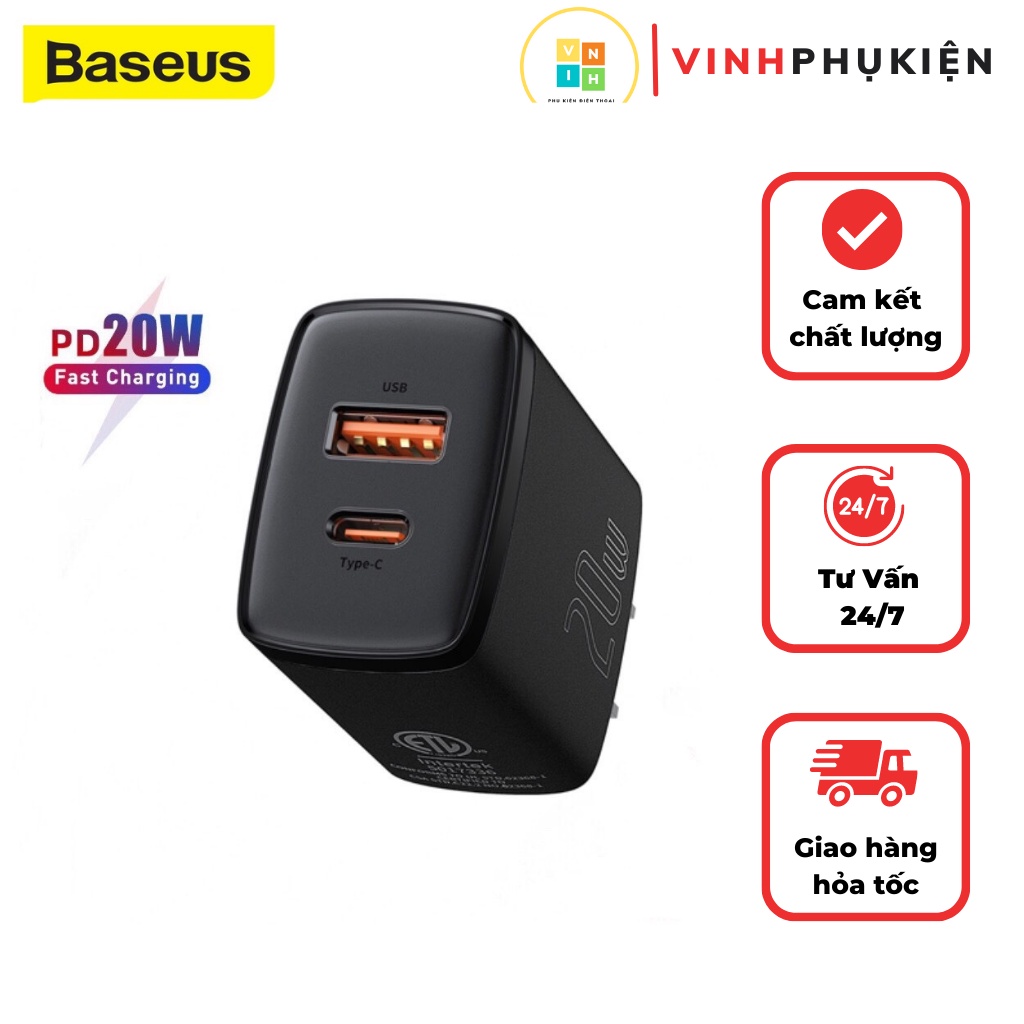 Điện Thoại & Phụ Kiện > Phụ kiện > Cáp, sạc & bộ chuyển đổi > Bộ sạc || Củ sạc nhanh 20w iphone ipad android samsung oppo xiaomi có 2 chân cắm typec và usb hỗ trợ sạc qc 3.0 chính hãng baseusCòn hàng