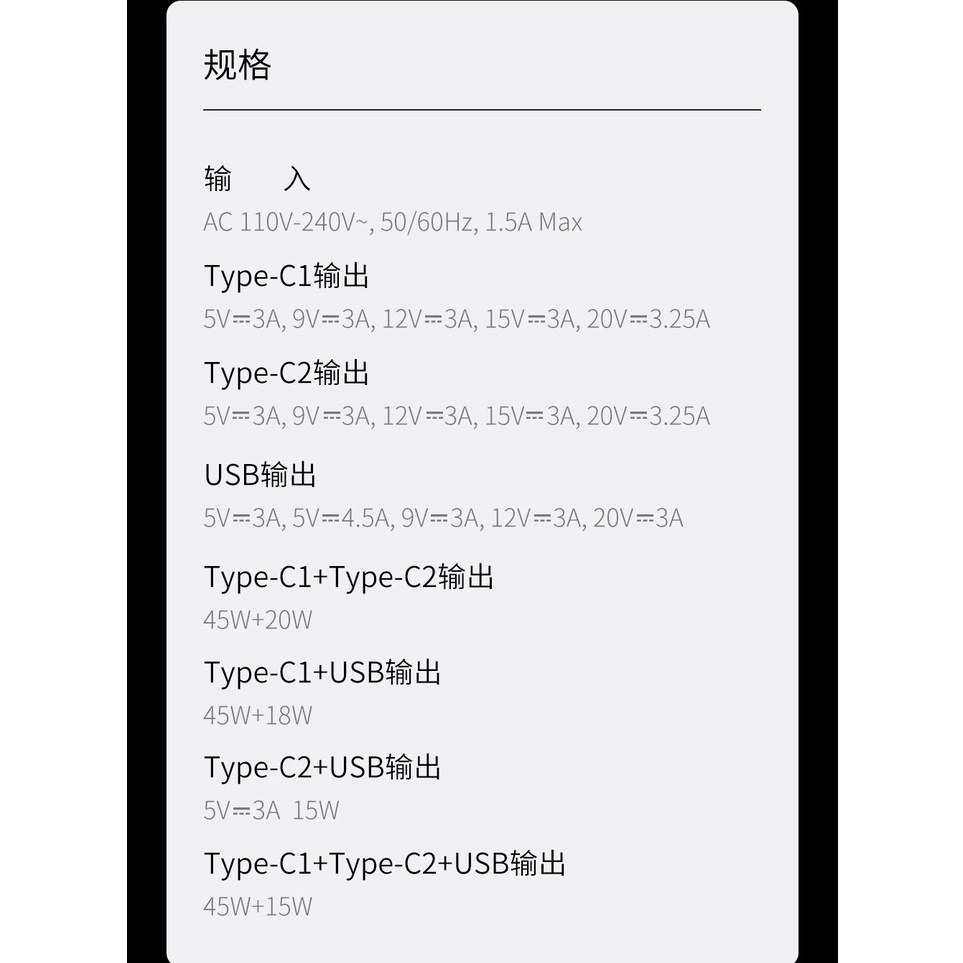 Type-C 1 + Type-C 2 + USB Output: 45W+15W(60W)
