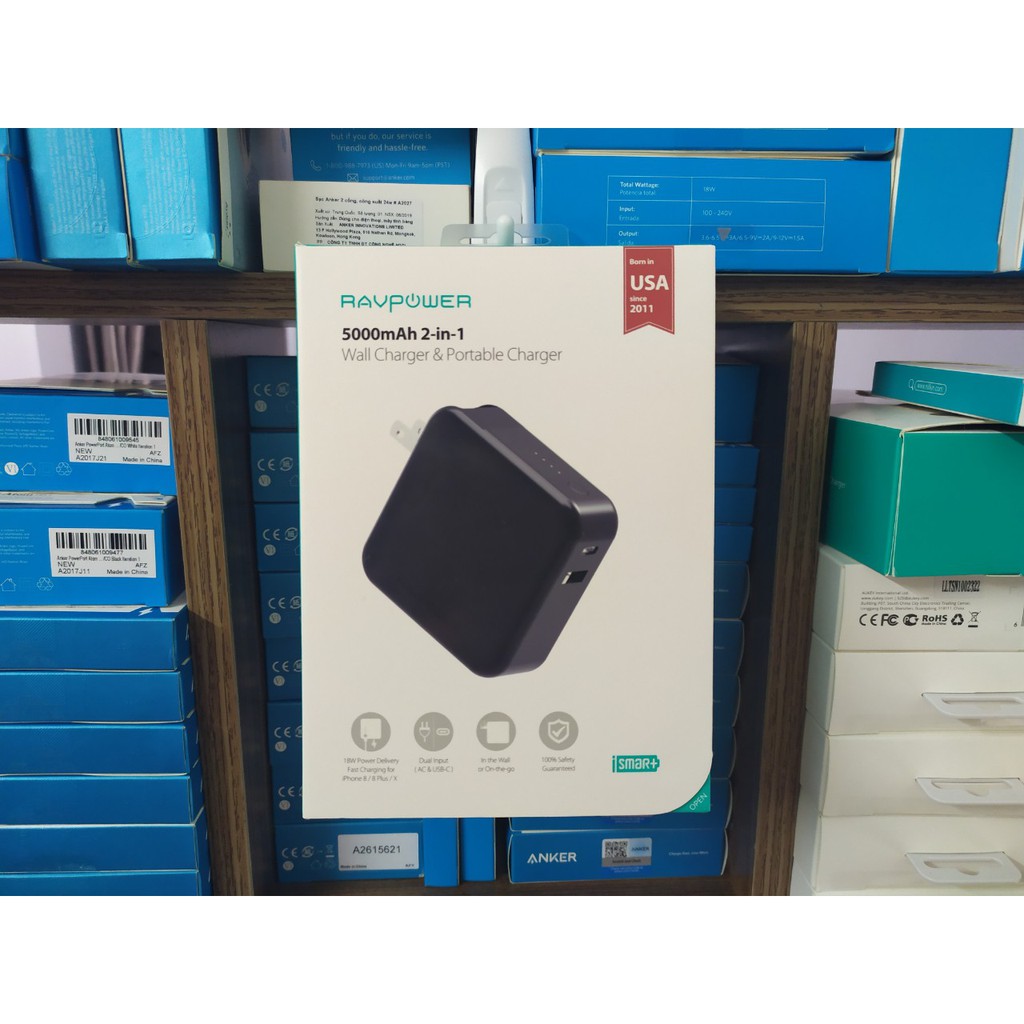 Củ Sạc Nhanh Kiêm Pin Dự Phòng RAVPower 5000mAh RP-PB101 Tích Hợp Usb-C In/Out Hỗ Trợ PD 18W và QC 3.0