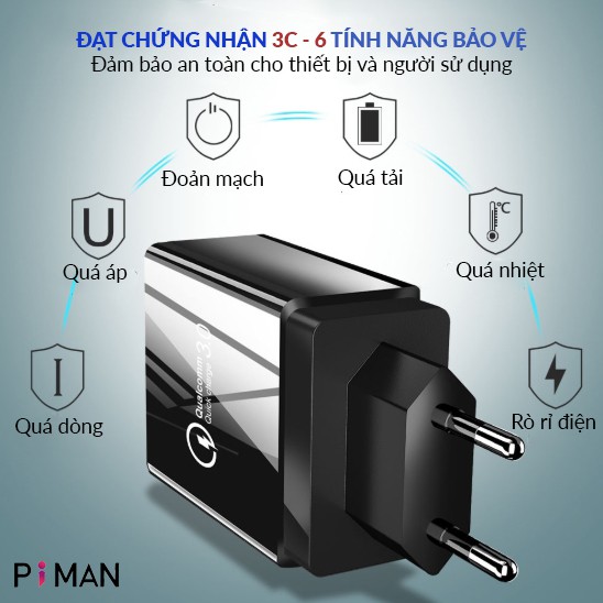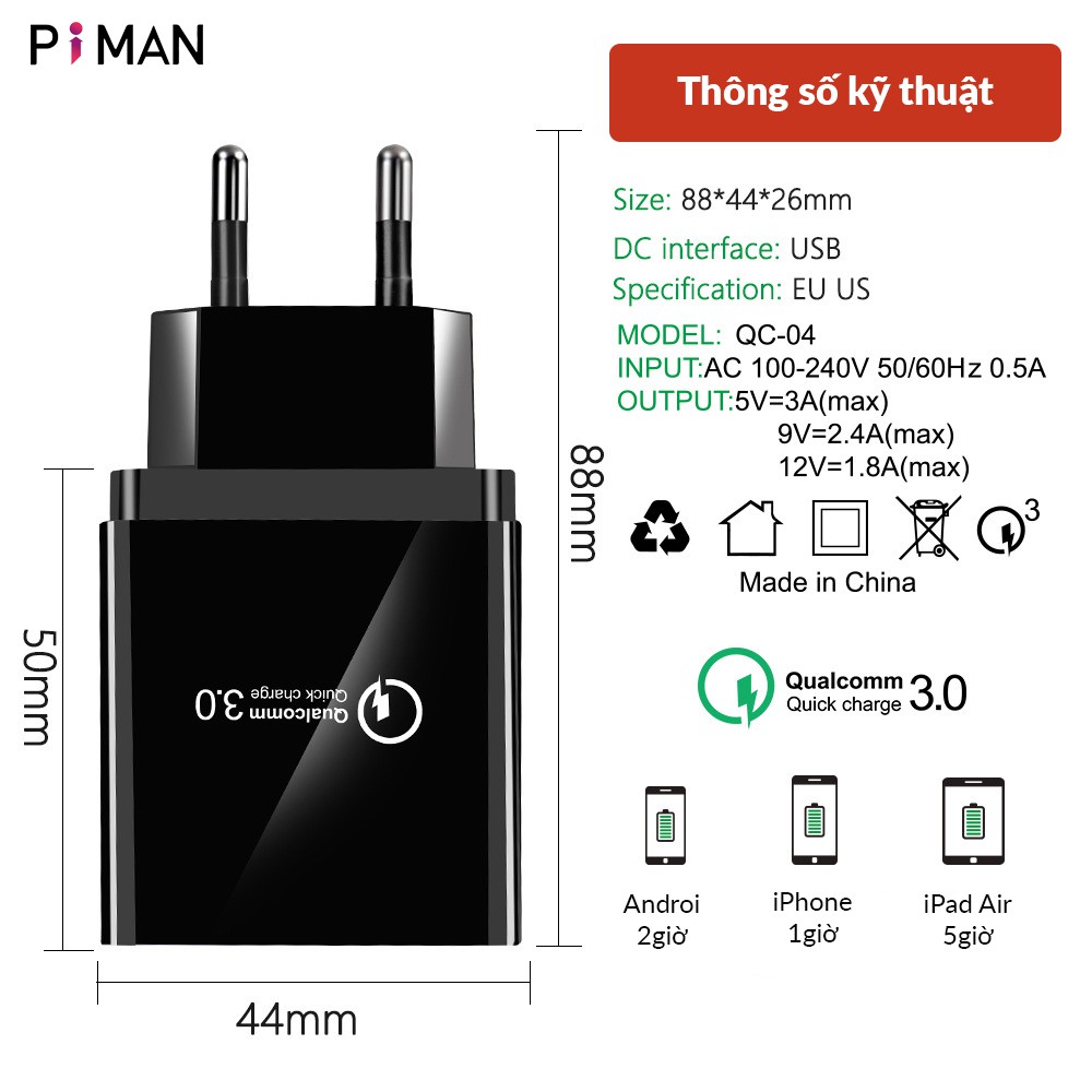 Củ Sạc Nhanh Piman Samsung Oppo Quick Charge 3.0 Kéo Dài Tuổi Thọ Cho Pin 20W P211THÔNG TIN CHI TIẾT: