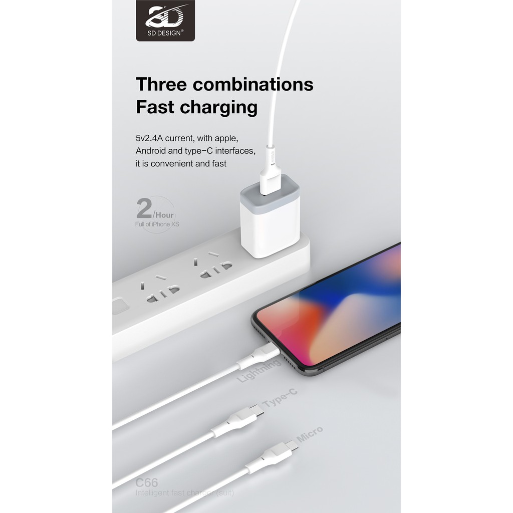Củ sạc SD C66 cổng USB 2.4A, cóc sạc dùng cho iPhone, iPad, Android - Chính hãng