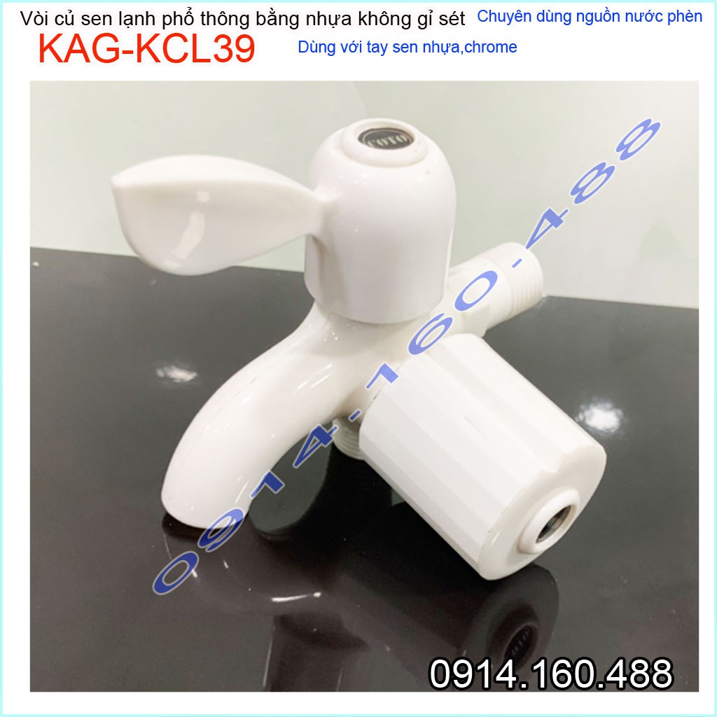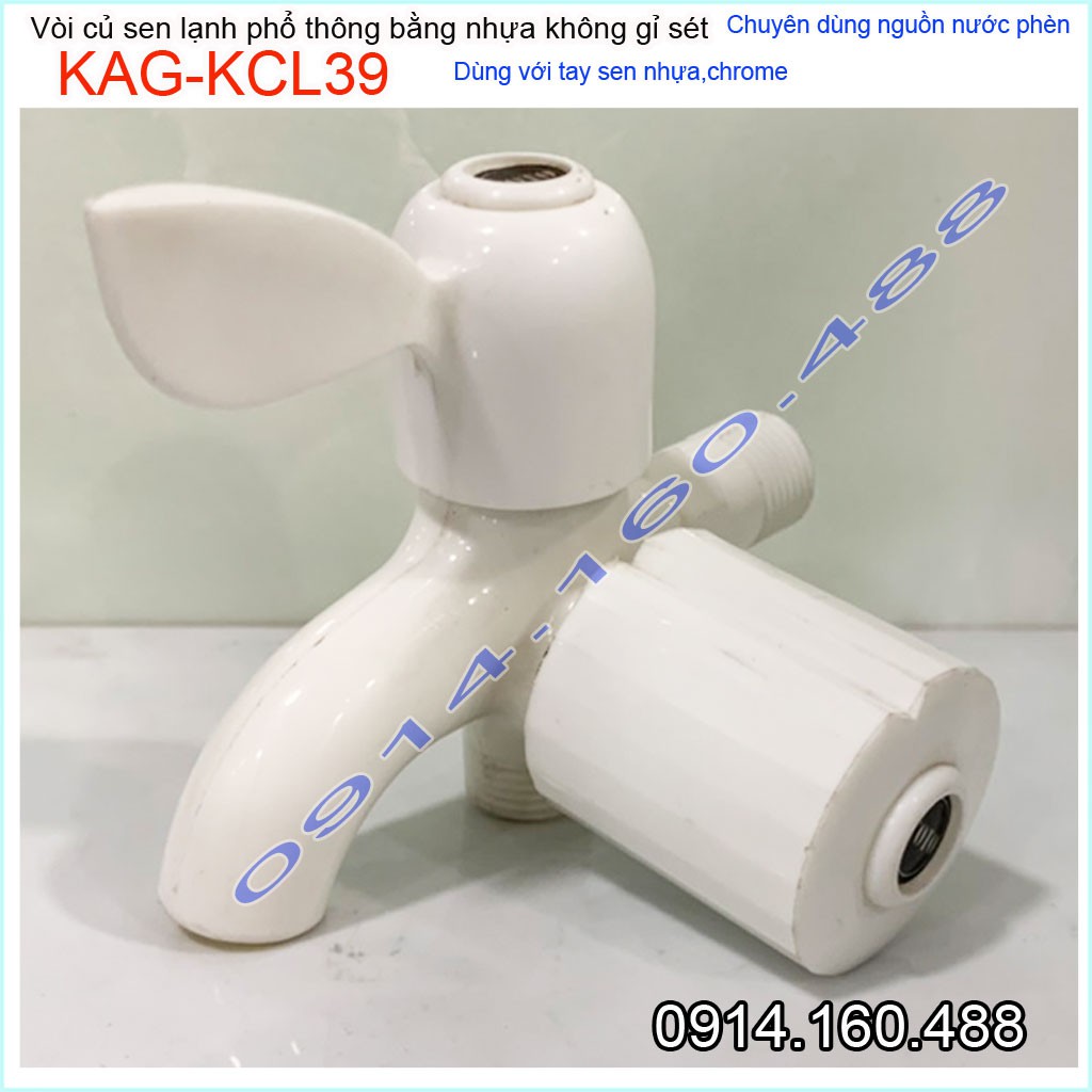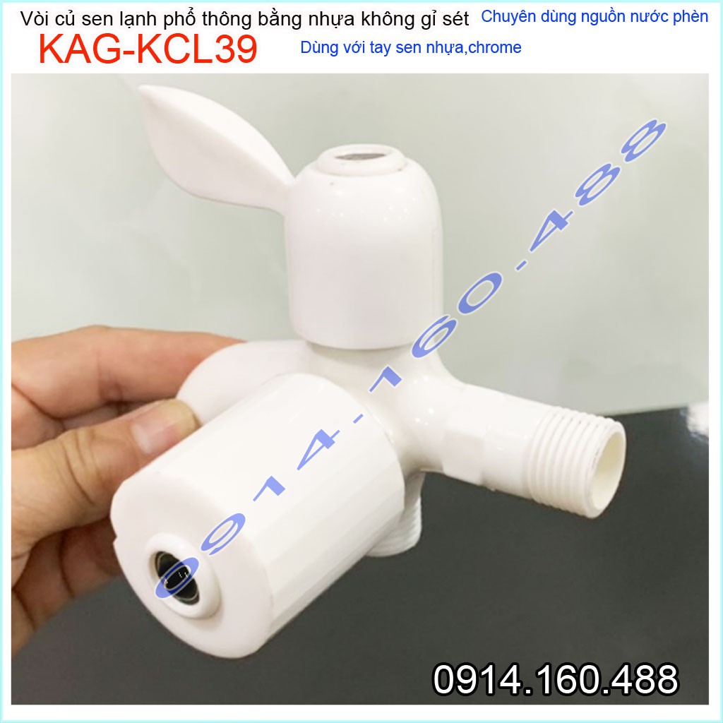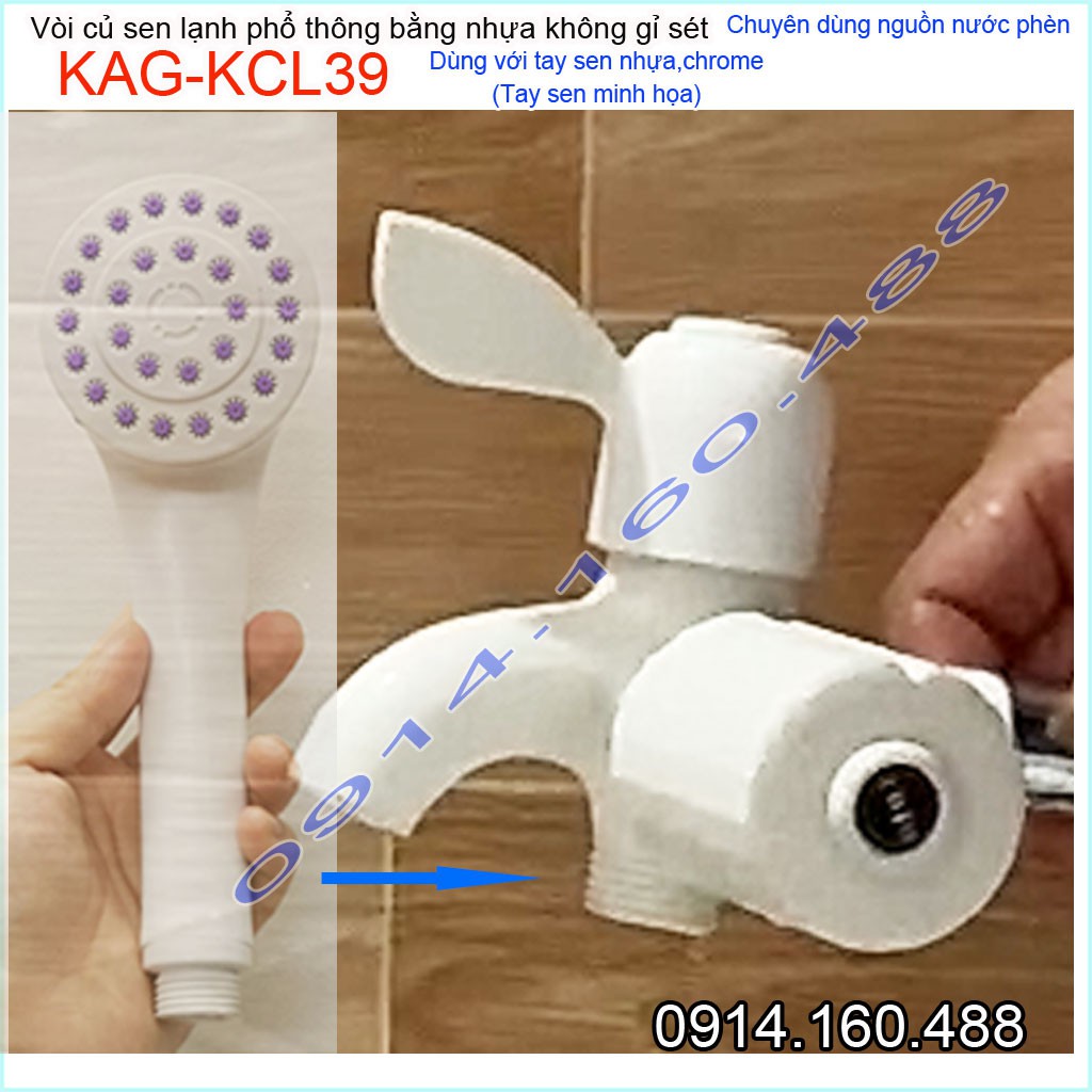 Củ sen lạnh nhựa KAG-KCL39, vòi sen nhựa 100% dùng vùng nước phèn không gỉ séc nước mạnh sử dụng tốtƯu điểm: Giá tốt- không gỉ séc-dùng cho vùng nước phèn-vùng biển lắp đặt phòng trọ, nhà nghỉ, nhà xưởng các công trình dân dụng