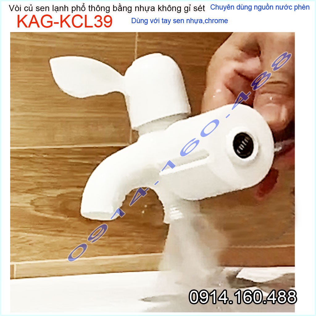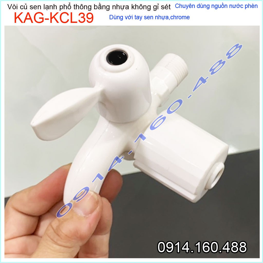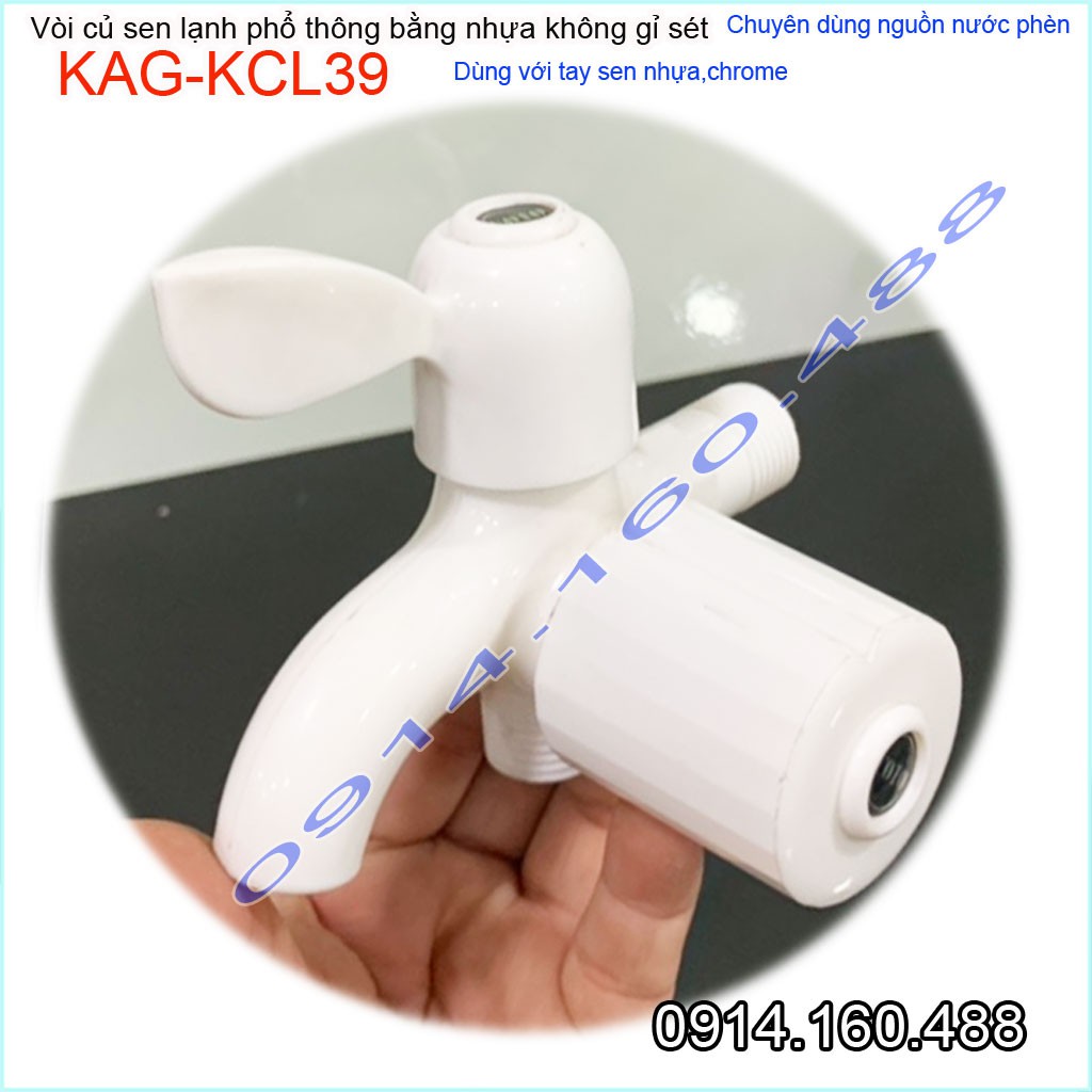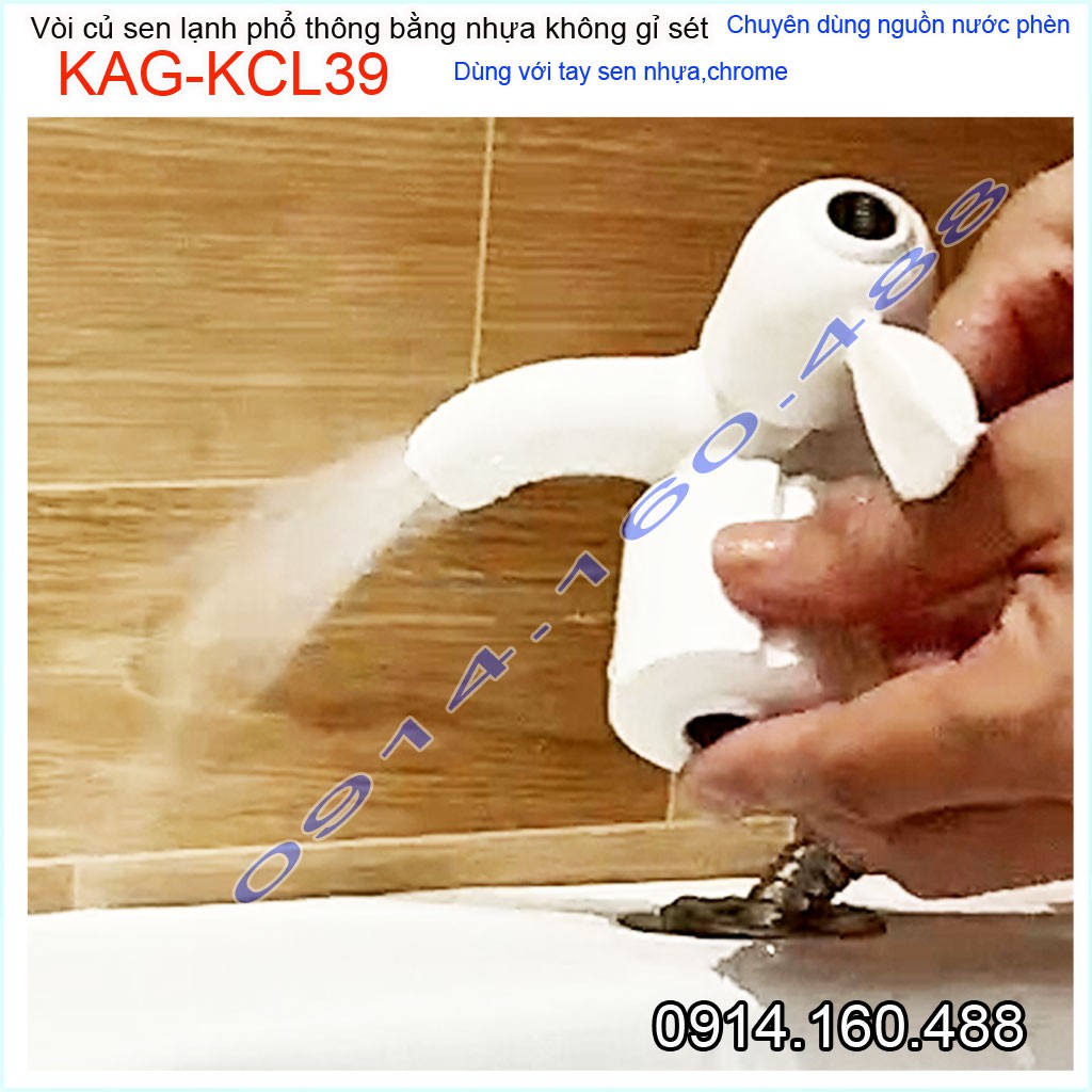 Củ sen lạnh nhựa KAG-KCL39, vòi sen nhựa 100% dùng vùng nước phèn không gỉ séc nước mạnh sử dụng tốtƯu điểm: Giá tốt- không gỉ séc-dùng cho vùng nước phèn-vùng biển lắp đặt phòng trọ, nhà nghỉ, nhà xưởng các công trình dân dụng