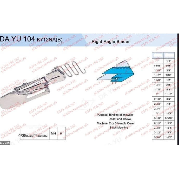 Cữ Dayu104 được sử dụng cho máy Kan sai dùng để bọc viền 2 mép (tức là cả 2 mép viền trên và dưới đều được gấp giấu). Hình minh họa kỹ thuật trên link thể hiện rõ nhất cách bọc viền và đường may sẽ như nàoCữ được sử dụng để bọc viền cổ áo, tay áo, đũng quần.......