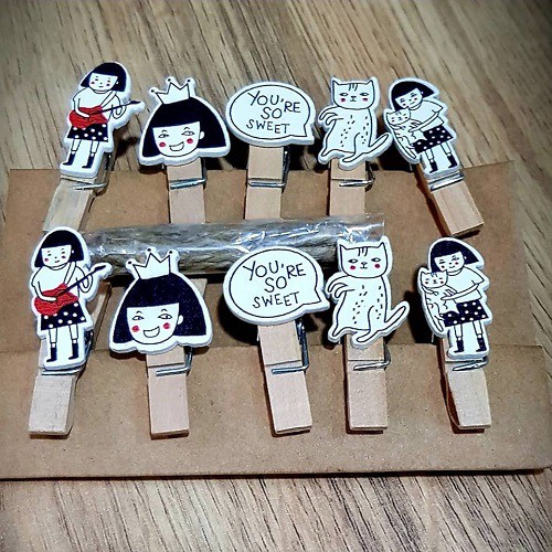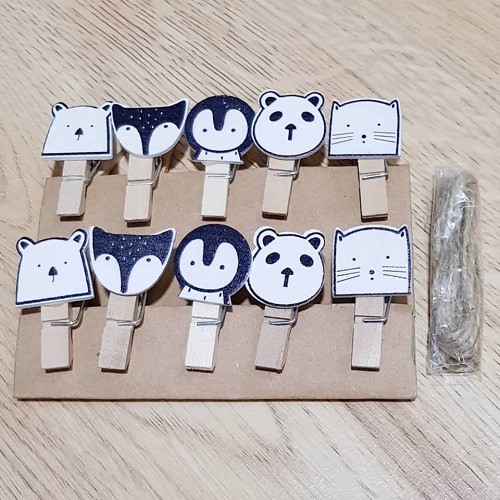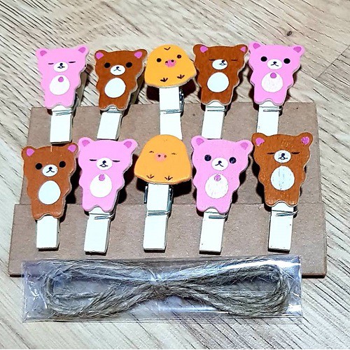 Bộ gồm 10 kẹp gỗ hình dễ thương xinh xắn...Kích thước: dài 4cm + 1m4 dây thừng gai đường kính 2 ly