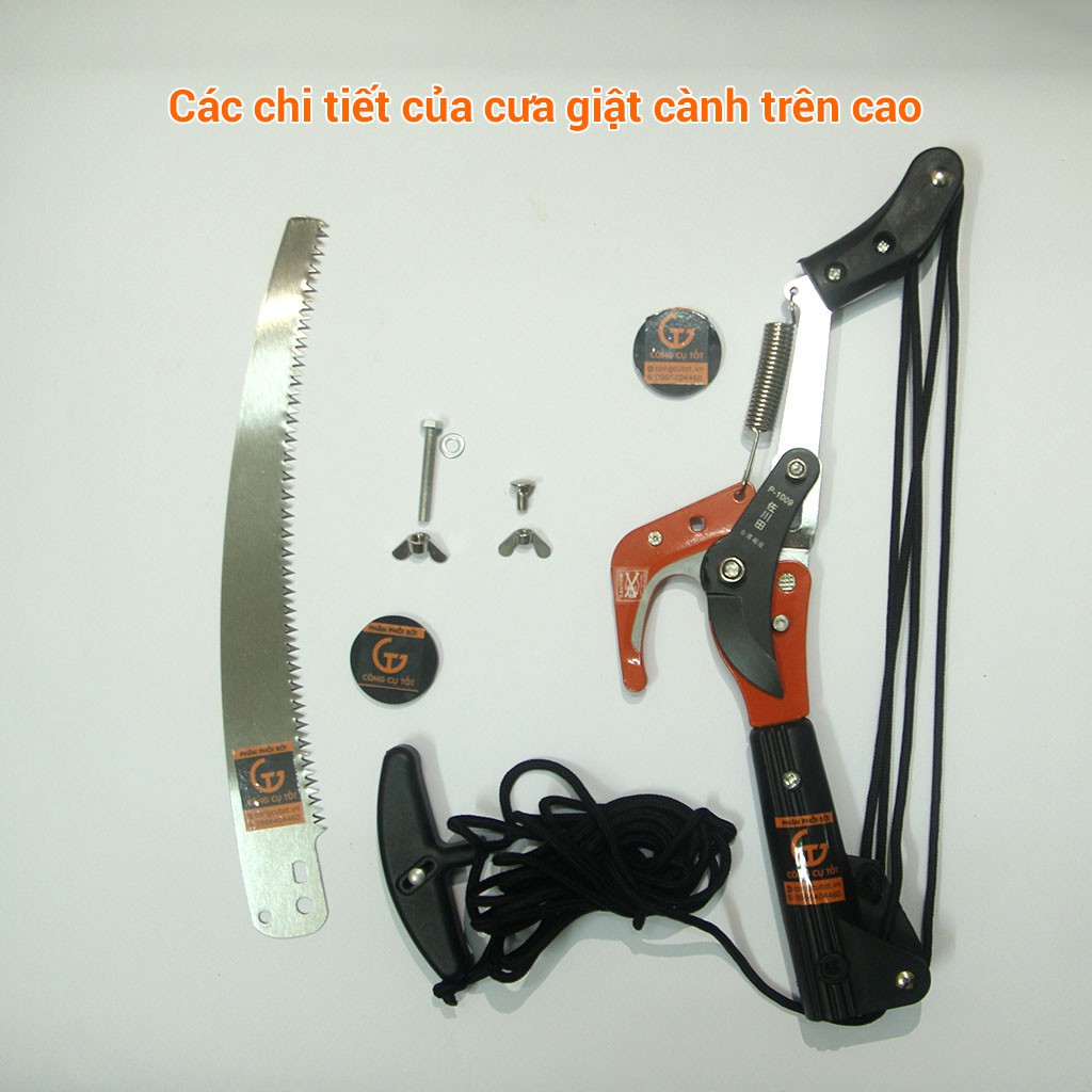 -Câu cắt cành già, cắt tỉa cành hư đường kính dưới 35mm : Với chiếc kéo được chế tạo như một chiếc móc câu, ta chỉ việc móc vào cành cần cắt rồi đứng dưới dùng dây để giật, thông qua hệ thống tăng lực bằng đòn bẩy và pa lăng 4 ròng rọc giúp tăng lực cắt lên 50 lần, dễ dàng cắt cành cứng.