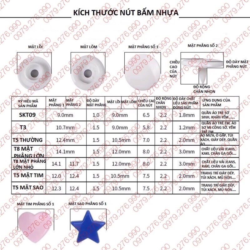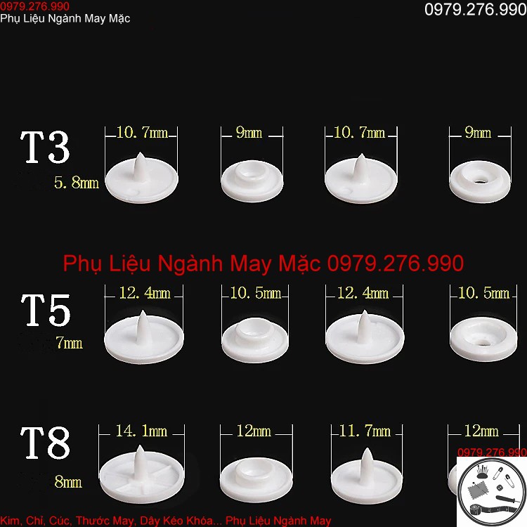 Lưu ý: Kích thước của cúc T3, T5 và T8 khác nhau. Shop có kèm hình minh họa các size cúc trên link để khách hàng so sánh và chọn lựa (thường dùng T5 vào các sản phẩm như: cúc quần âu nữ, áo mưa, đóng mở cặp tài liệu Clear bag......)