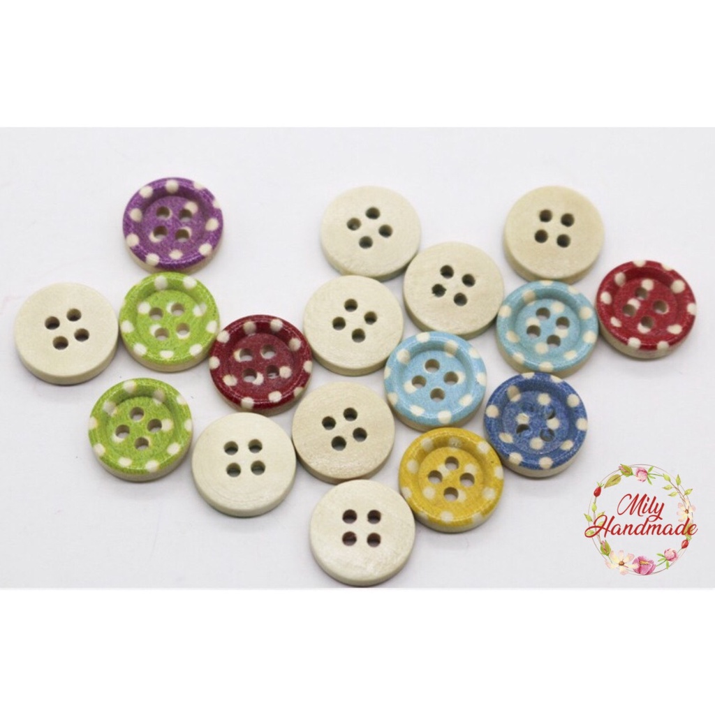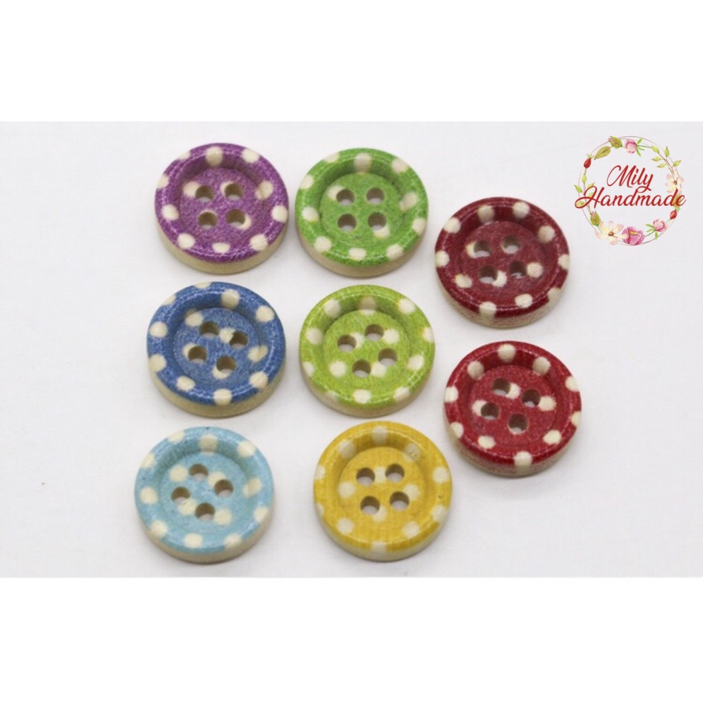 Sở thích & Sưu tầm > Dụng Cụ May Vá || Cúc gỗ chấm bi nhiều màu( gói 20 cái)Còn hàng