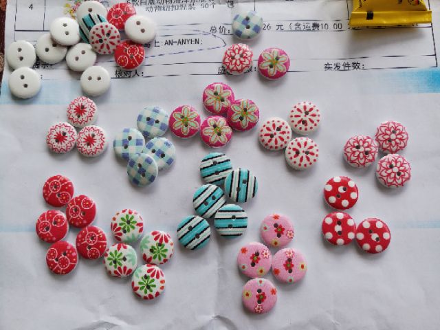 Gói 50 cúc gỗ nhiều màu 15mm.Các bạn nhắn tin mẫu cần mua cho tớ nhé.