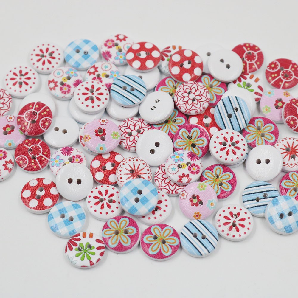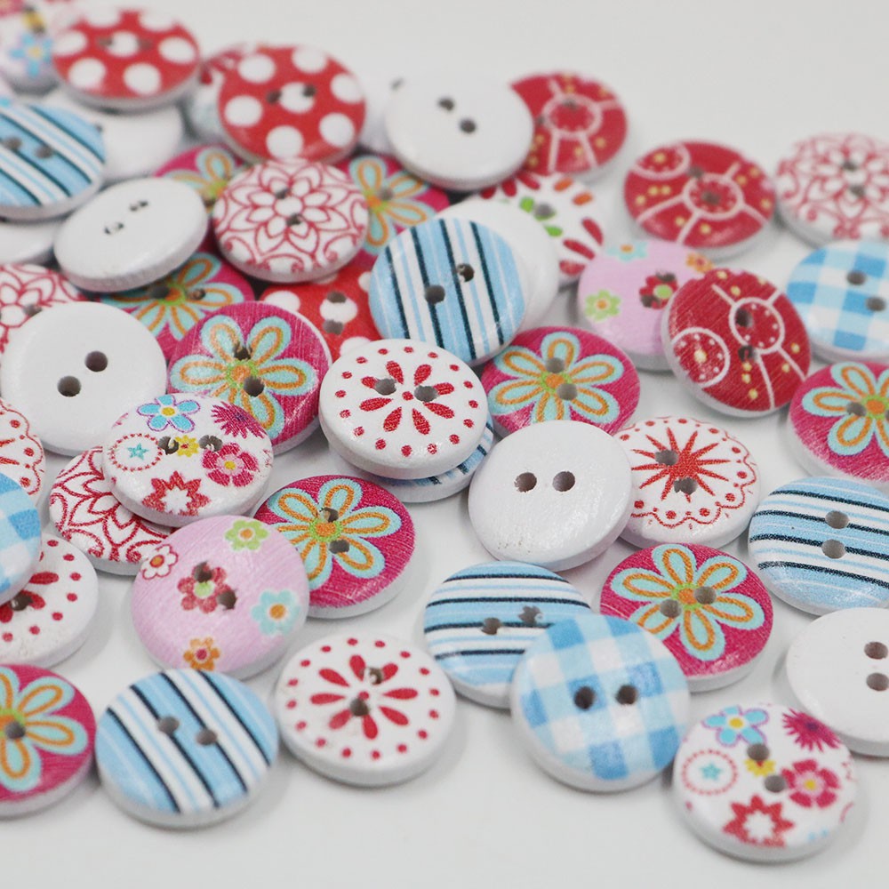 Cúc gỗ được phủ sơn, vẽ họa tiết các màu, dùng làm khuy áo, phụ kiện, các sản phẩm handmade...Đường kính cúc 15mm.