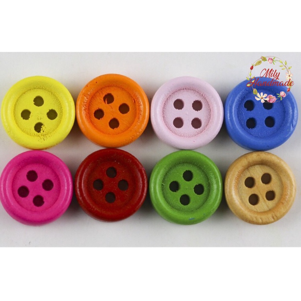 Cúc gỗ nhiều màu sắc 4 lỗ, 2 size 13mm và 15mmmỗi gói 20 cái( 10 cặp)