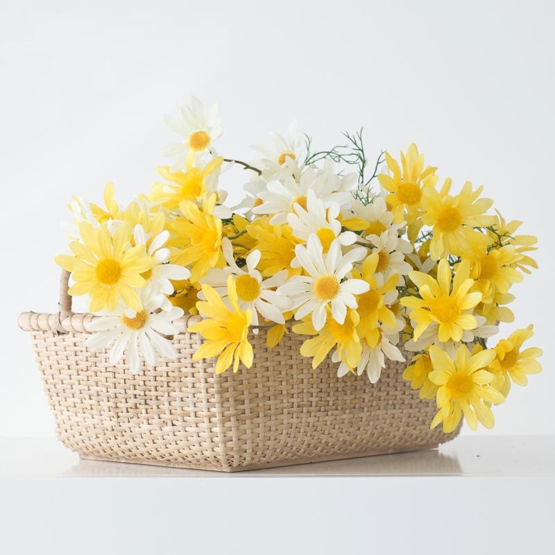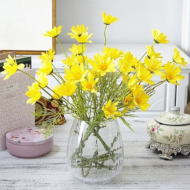 Hoa giả cúc họa mi thường được cắm bình sứ, bình thủy tinh sang trọng để trang trí kệ tivi, phòng khách, bàn ăn...hoặc làm những giỏ hoa treo tường độc đáo, điểm các bình hoa