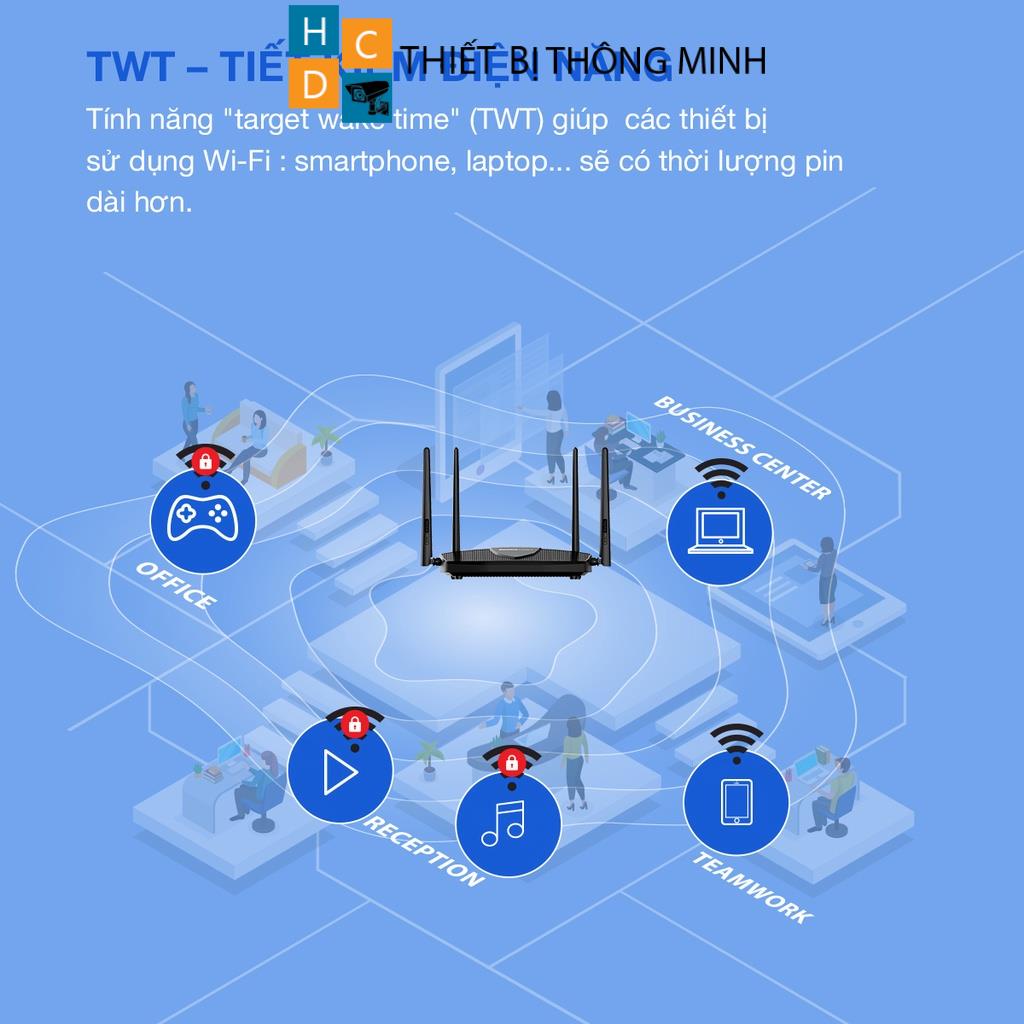 Tính năng “Target Wake Time” (TWT) giúp các thiết bị sử dụng Wi-Fi như smartphone, laptop… sẽ có thời lượng sử dụng pin dài hơn, không hao phí pin của thiết bị nhờ vào cơ chế thông minh giúp router biết khi nào nên để Wi-Fi “ngủ” và khi nào cần “đánh thức” để tiếp nhận đường truyền tiếp theo.
