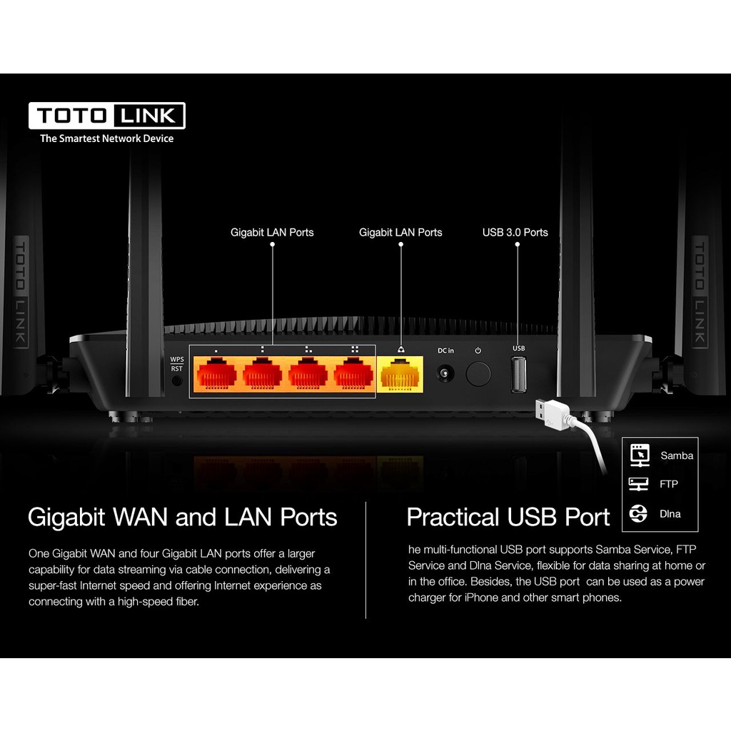 Với 4 cổng LAN và 1 cổng WAN chuẩn Gigabit, A3002RU-V2 mang lại cho bạn tốc độ truyền tải dữ liệu qua dây cáp mạnh mẽ, nhanh gấp 10 lần so với tốc độ thông thường.