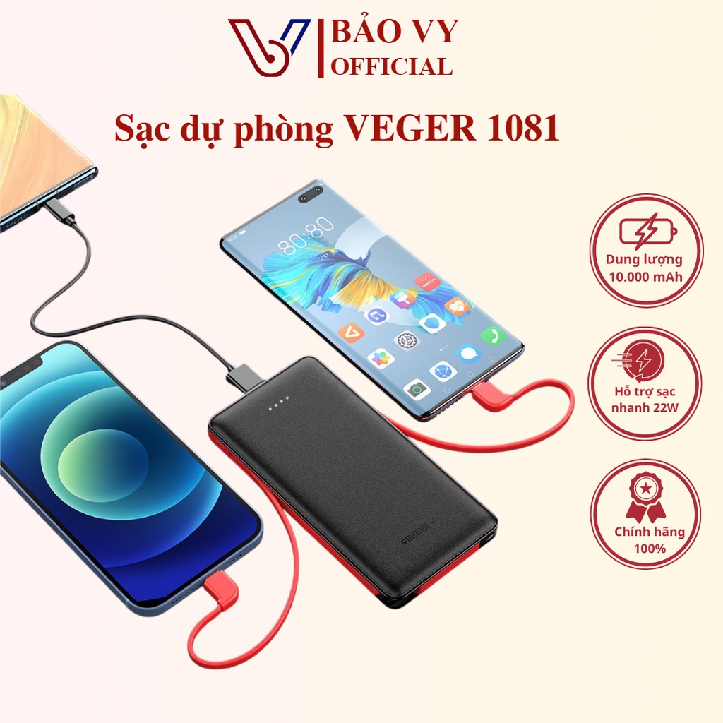 Cục sạc dự phòng 10000mah Veger VP1081, Pin dự phòng chính hãng có dây sạc iphone typec tích hợp sạc nhanh 2A - BAOVY