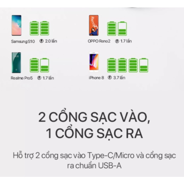 Nguồn ra: 01 USB, 01 Type C, 01 Đầu Lightning, 01 Đầu Type C