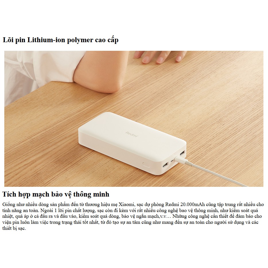 Bên cạnh khả năng sạc nhanh, pin sạc 20000 của Redmi cũng có một lõi pin khá cao cấp. Sử dụng lõi pin Polymer ion lithium, loại pin được sử dụng phổ biến trên những dòng sản phẩm smartphone, máy tính bảng, laptop hiện nay. Với đặc tính tuổi thọ cao và tính ổn định cao hơn rất nhiều so với loại pin Ion truyền thống, lõi pin lithium mới sẽ giúp đảm bảo hiểu quả sạc và giữ cho tuổi thọ của viên pin dự phòng kéo dài hơn.