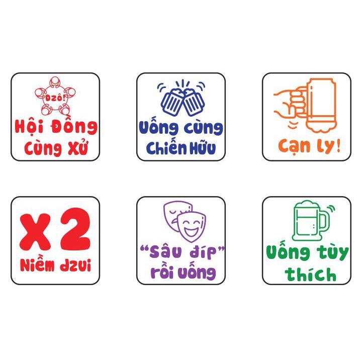 - 6 mặt với 6 khẩu lệnh: Uống nửa ly, chỉ định người uống, mớm "mồi" cho người bên phải, người đối điện uống,qua lượt (không phải uống), uống cùng chiến hữu (chọn 1 người trong bàn & cạn ly cùng nhau)