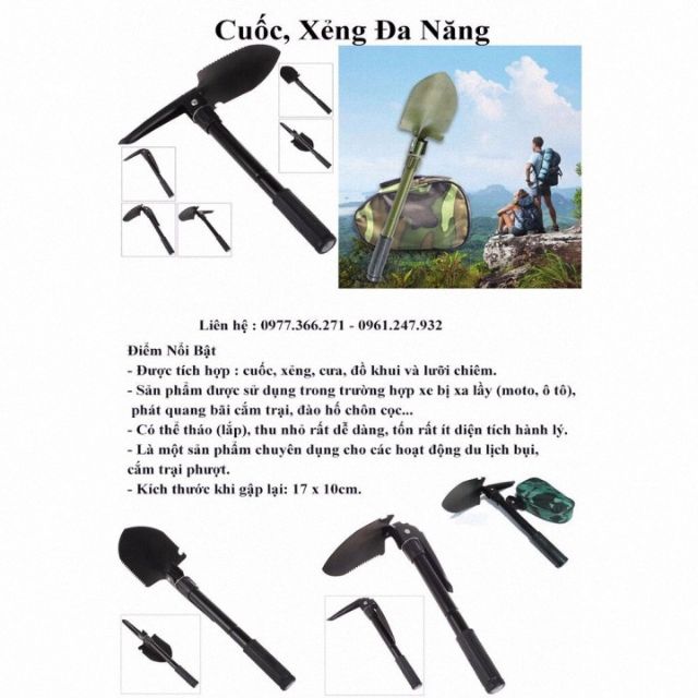 Thiết kế thông minh, nhỏ gọn, sử dụng để khi làm vườn hoặc mang theo khi đi du lịch với Bộ cuốc xẻng đa năng 4 trong 1Bộ cuốc xẻng đa năng 4 trong 1 là một sản phẩm chuyên dụng cho các hoạt động du lịch bụi, cắm trại phượt.. Ngoài ra, bạn vẫn có thể sử dụng trong hoạt động hằng ngày như chăm sóc cây cảnh, làm vườn.