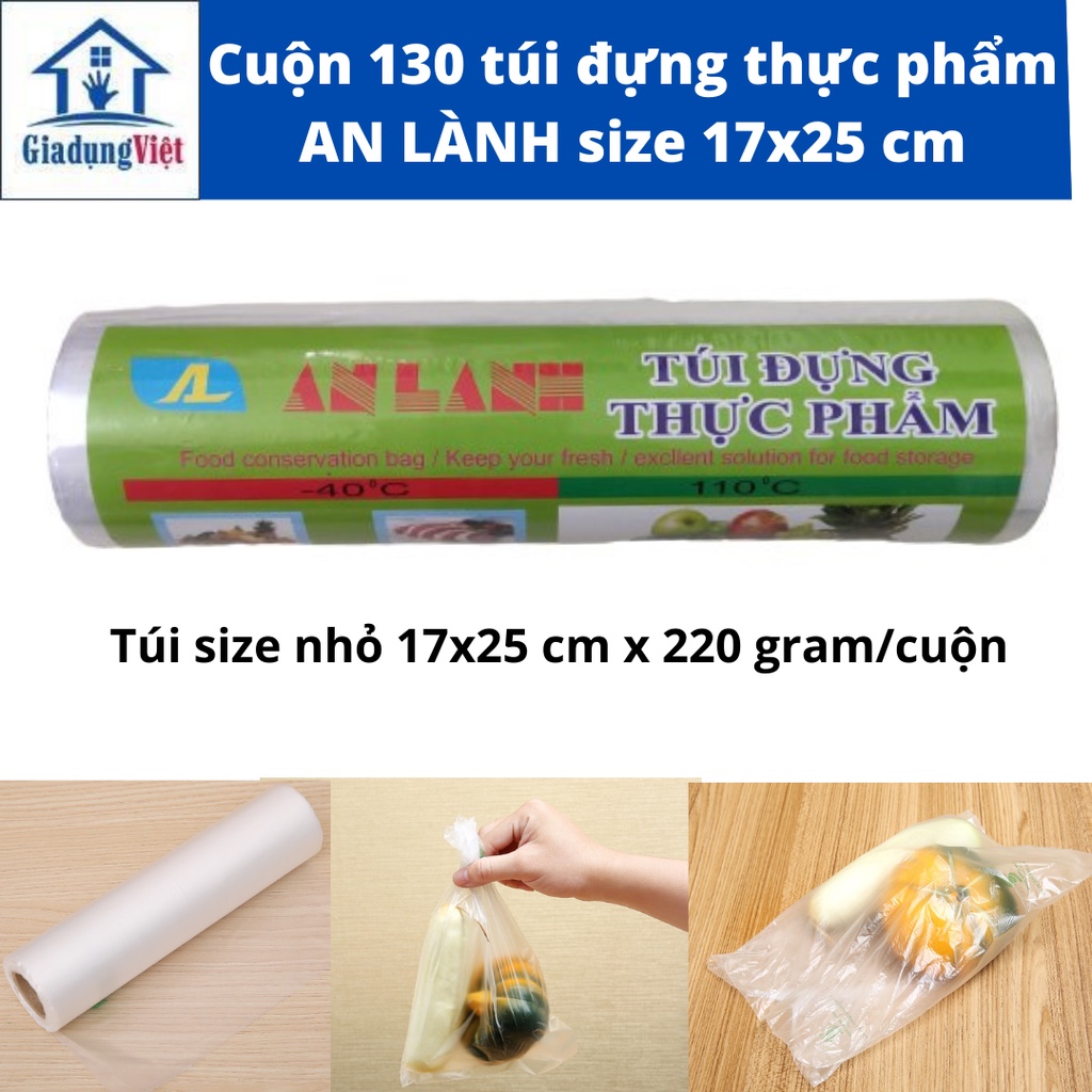 Cuộn 200 túi đựng thực phẩm An Lành kích thước 17x25cm - 0.22 Kg - Tương đương khoảng 130 túiTúi cỡ nhỏ thích hợp dùng đựng thịt cá đã làm sẵn, mỗi lần nấu thì rã đông ra là dùng được, bảo quản tốt không mất nhiều thời gian.