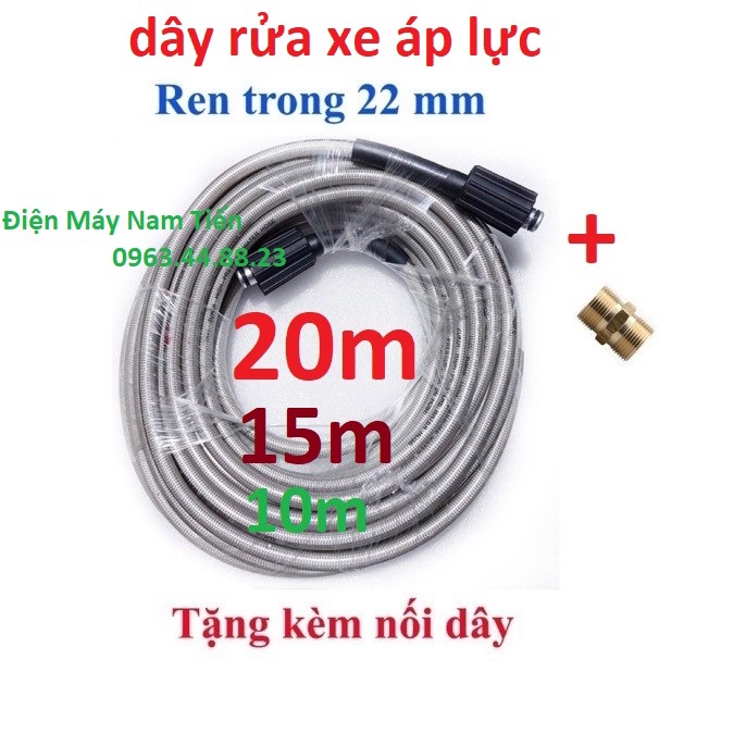 Dây cao áp bố vải dùng cho máy rửa xe.Ren trong 22, dùng cho 80% các loại máy rửa xe trên thị trường.