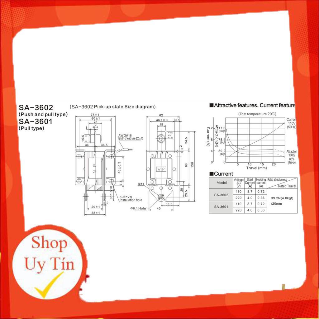 Giới thiệu Cuộn hút 220V SA-3602 19.6N kéo 4kg hành trình 15mm