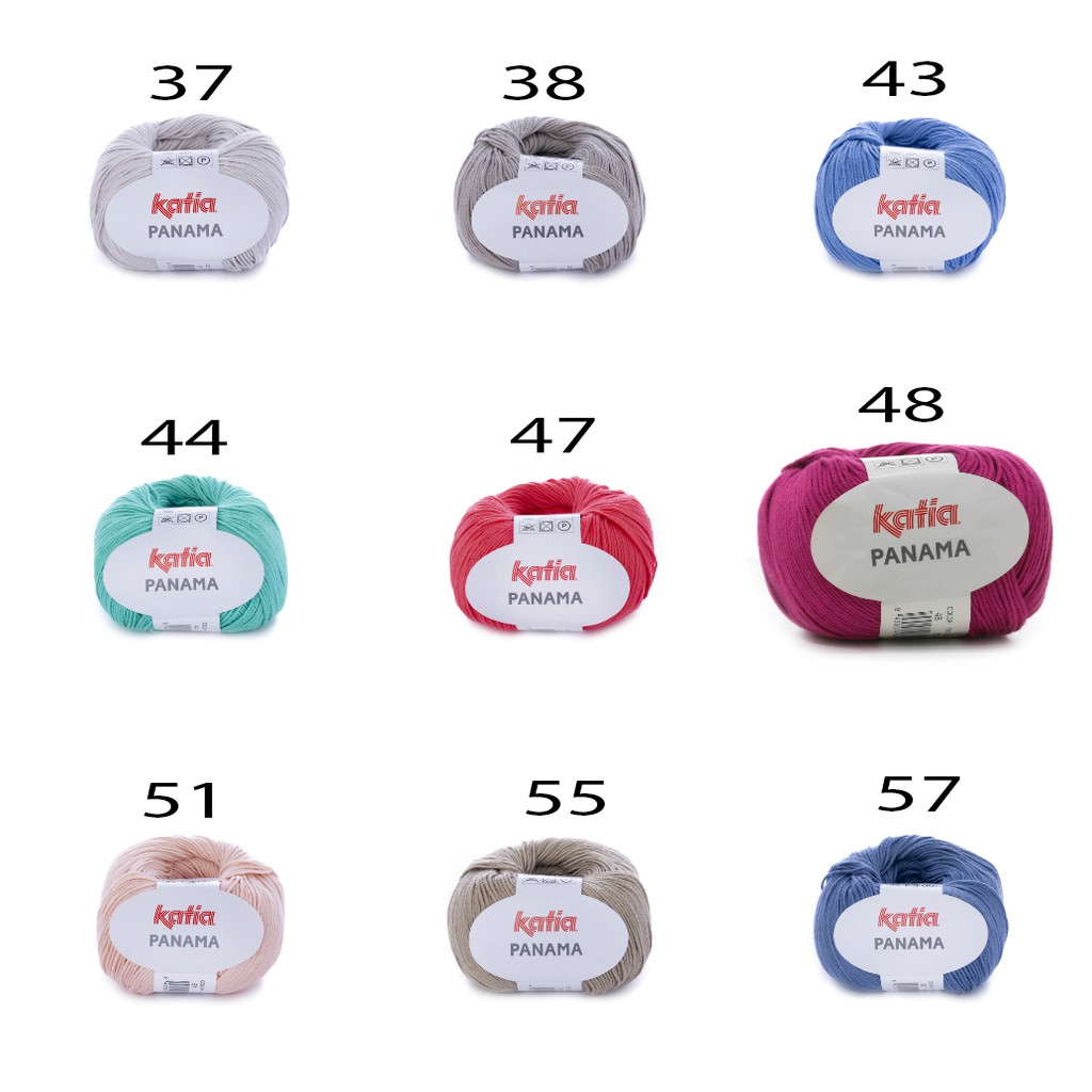 Cuộn Len Cotton Katia Panama (bảng màu 1)100% matt finish cotton yarn with a huge variety of colours. Panama is fantastic for making comfortable bibbed romper suits, baby jackets and spring jumpers. Recommended yarn for amigurumis and crochet projects.