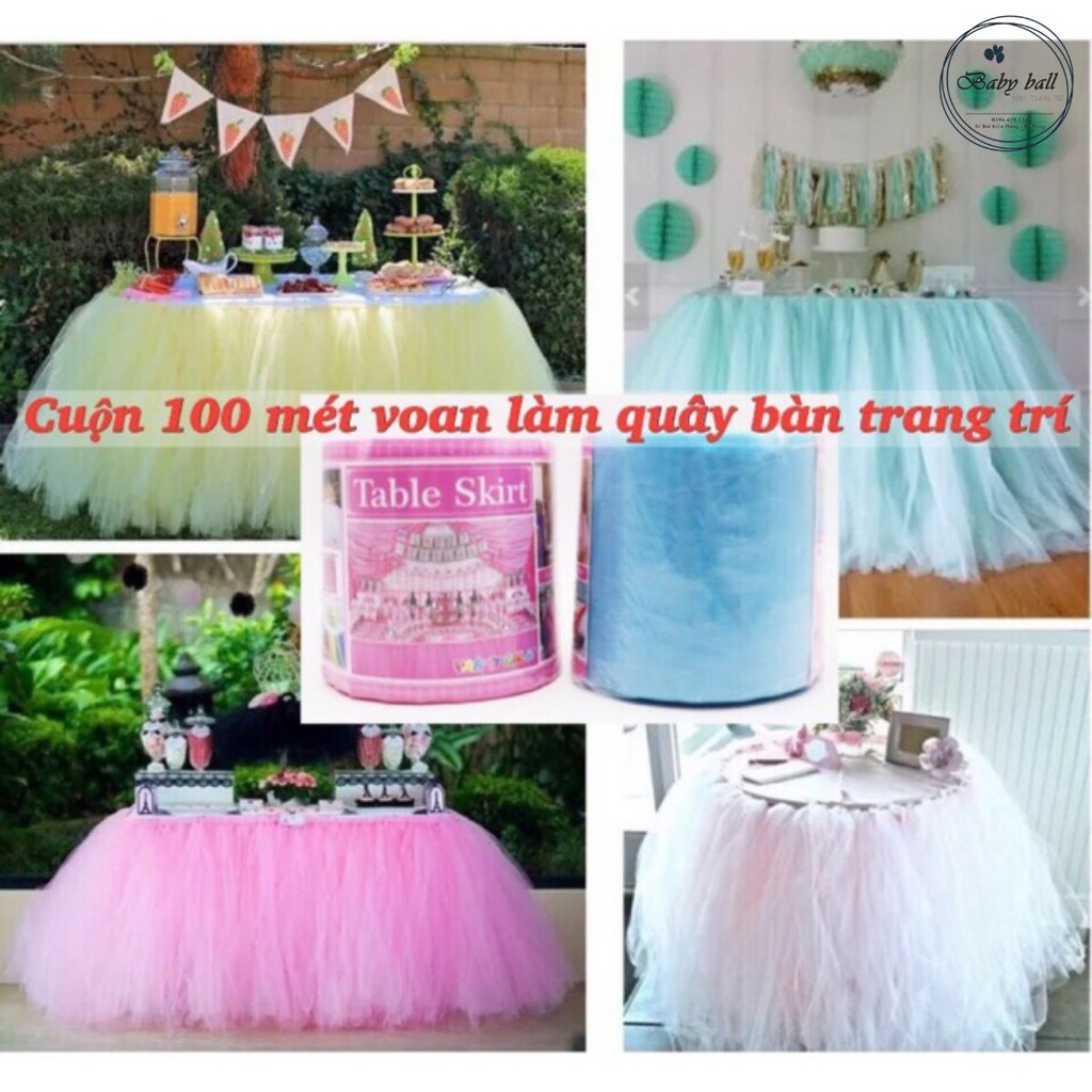 - 1 cuộn 100m kết được 1 dây khoảng 1m - 1m2 với chiều cao 80cm, kích thước shop báo là kích thước trung bình chung làm được, tuỳ khách muốn làm bàn cao thấp mà được đoạn voan dày mỏng khac nhau! Muốn vây bàn dài và dày khách dùng từ 2 cuộn trở lên!