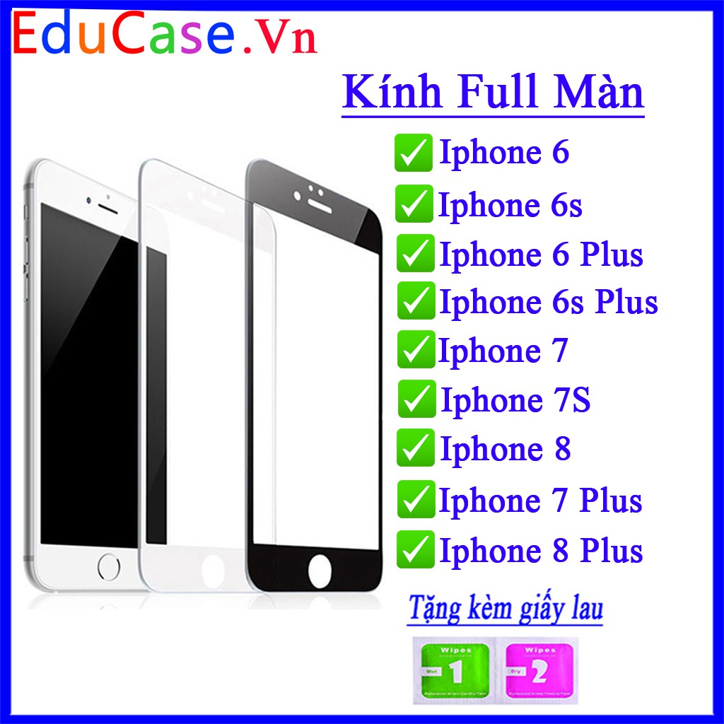 Cường lực IPHONE 6/6S/6PLUS/6SPLUS/7/8/7PLUS/8PLUS Full màn hình,Tặng kèm mỗi kính một bộ giấy lau Educase.vn