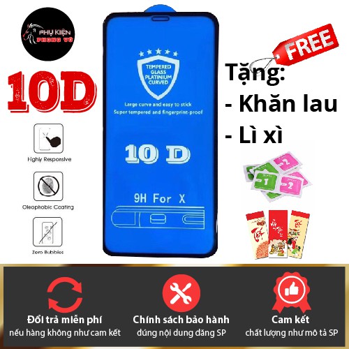 Cường lực iphone 6 Plus 7 Plus 8 Plus X Xr Xs Max 11 pro max Full màn Chống vân 10D - Không tràn viền - cách mép 0.1mmLoại 10D : keo ăn hơn