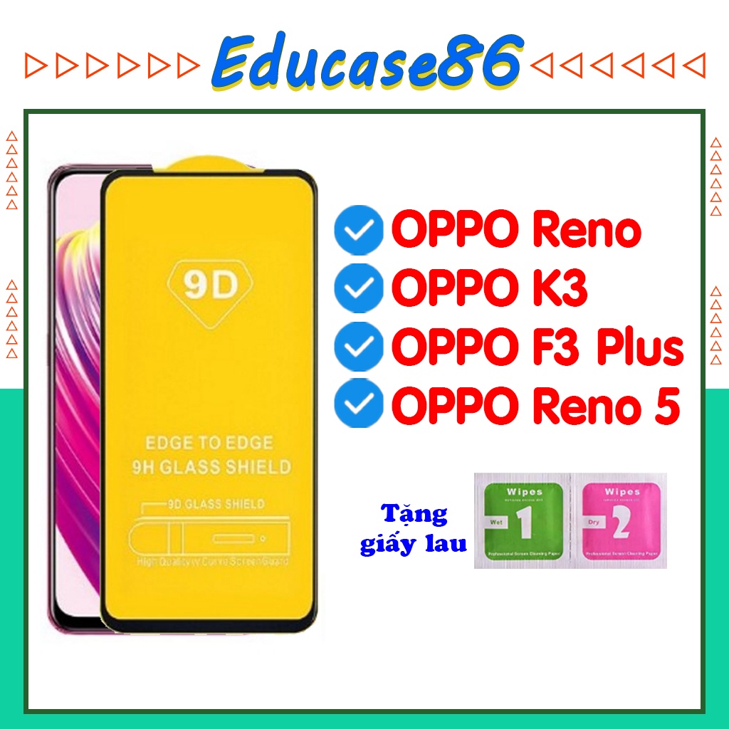 Cường lực OPPO RENO, OPPO F3 PLUS, OPPO K3 ,RENO 5, A5 2020, A9 2020 full màn hình , Tặng kèm giấy lau kính Educase86