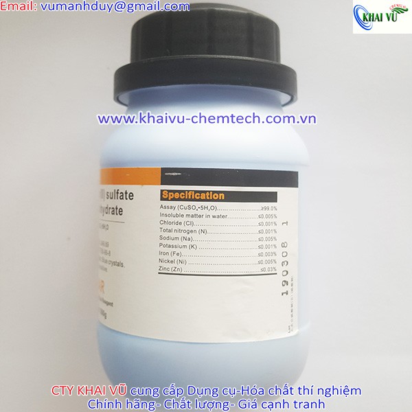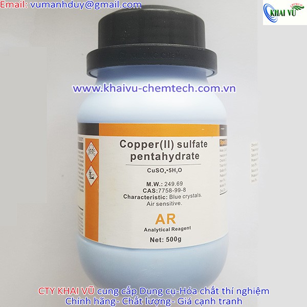 Đồng(II) sulfate là hợp chất hóa học với công thức là CuSO4. Muối này tồn tại dưới một vài dạng ngậm nước khác nhau: CuSO4 (muối khan, khoáng vật chalcocyanite), CuSO4.5H2O (dạng pentahydrat phổ biến nhất, khoáng vật chalcanthite), CuSO4.3H2O (dạng trihydrat, khoáng vật bonattite) và CuSO4.7H2O (dạng heptahydrat, khoáng vật boothite).Công ty KHAI VŨ chuyên cung cấp Hóa chất CuSO4 đồng sulfate 500g copper II sulfate đồng sunphat Xylong tinh khiết CuSO4.5H2O