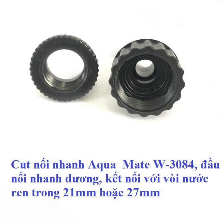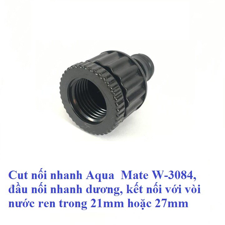 Cut nối nhanh Aqua Mate W-3084, đầu nối nhanh dương, kết nối với vòi nước ren trong 21mm hoặc 27mmCut nối nhanh Aqua Mate W-3084, đầu nối nhanh dương, kết nối với vòi nước ren trong 21mm hoặc 27mm thông thường, chất liệu bằng nhựa ABS. Nhập khẩu Đài Loan, nhãn hiệu Aqua Mate, mới 100%.