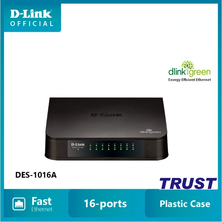 - Xu hướng thân thiện môi trường: Bộ chuyển mạch 16 cổng 10/100Mbps DES-1016A là một phần trong chuỗi thiết bị dành cho văn phòng nhỏ, doanh nghiệp cỡ vừa và nhỏ. Được trang bị công nghệ Green của D-Link, thiết bị giúp tiết kiệm năng lượng, giảm sinh nhiệt và tuổi thọ sản phẩm dài hơn mà không làm mất hiệu suất hoặc chức năng hoạt động. Sử dụng bộ điều hợp tiết kiệm năng lượng (đủ điều kiện Energy Star Level V), giảm thiểu việc sử dụng các chất độc hại (tuân thủ RoHS) và bao bì có thể tái chế làm cho bộ chuyển mạch này thực sự thân thiện với môi trường.