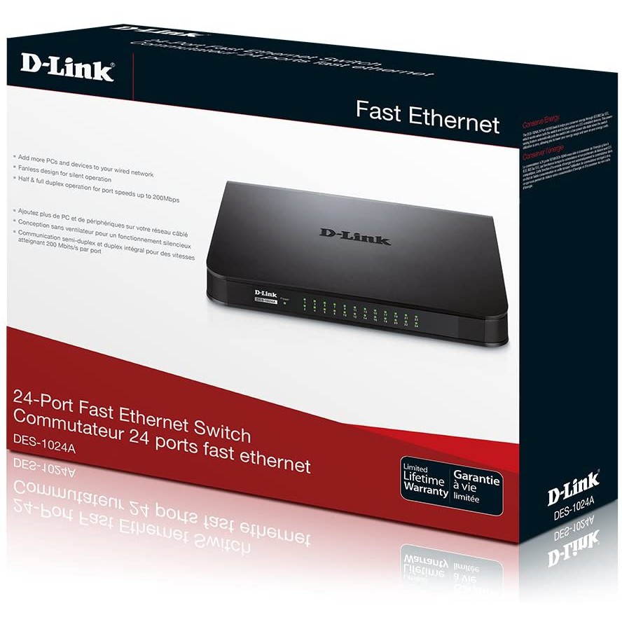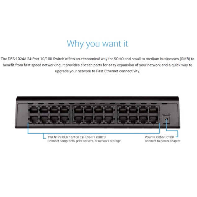 D-LINK DES-1024A - Bộ chia cổng mạng 24 Port 10/100D-LINK DES-1024A giúp bạn dễ dàng mở rộng hệ thống mạng bằng cách cho phép kết nối thêm nhiều máy tính và thiết bị hơn, mỗi máy có thể đạt được tốc độ lên đến 200 Mbps trên mỗi cổng ở chế độ song công toàn phần. Kết nối nhanh chóng và an toàn các nhân viên làm việc trong văn phòng nhỏ với với nhau và với tất cả các máy chủ, máy in và các thiết bị khác mà họ sử dụng. Hiệu suất cao và kết nối đáng tin cậy giúp tăng tốc độ truyền tệp và xử lý dữ liệu, cải thiện thời gian hoạt động mạng, giữ cho nhân viên của bạn luôn kết nối và làm việc hiệu quả.