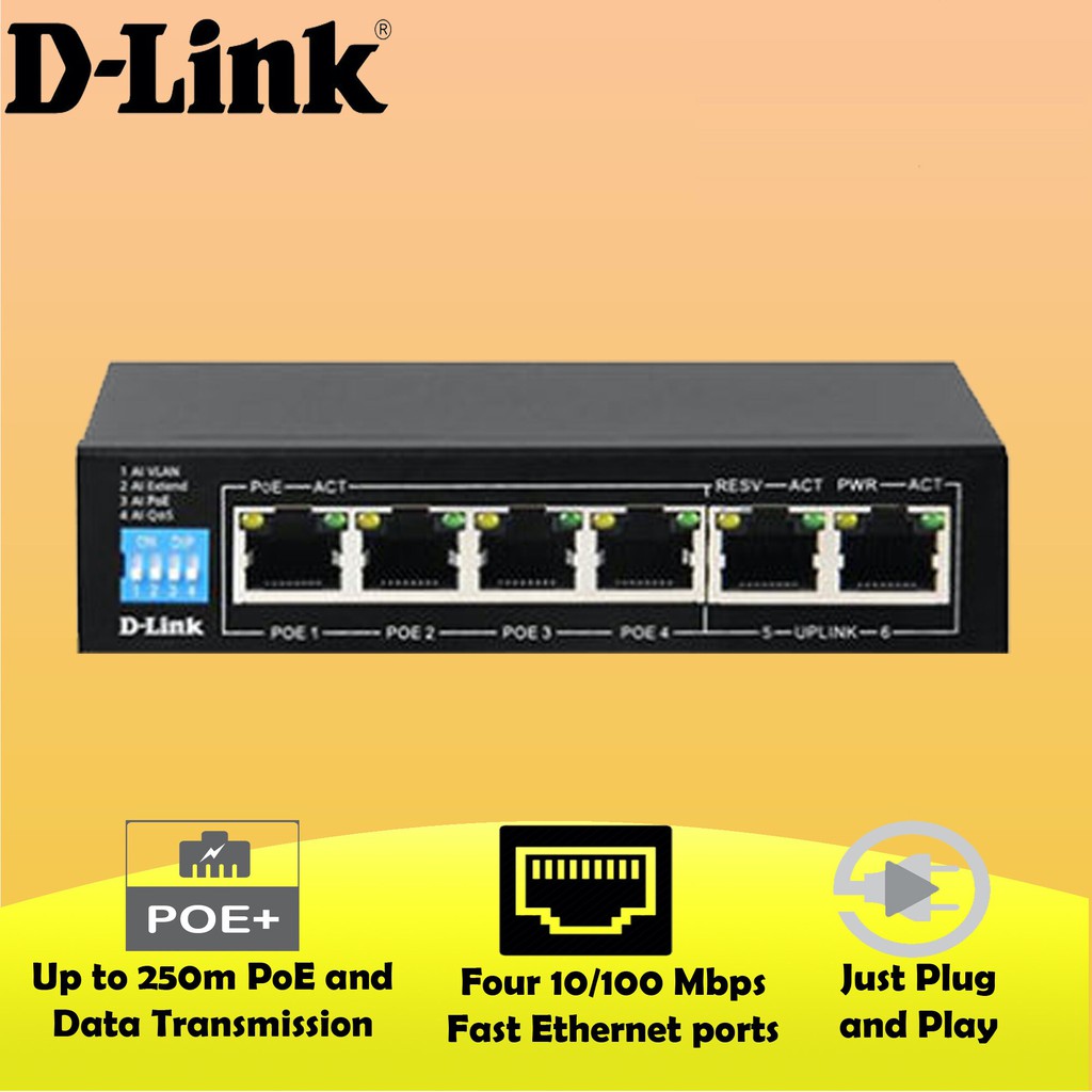 D-LINK DES-F1006P-E - Bộ chia cổng mạng 250M 6 cổng 10/100 (4 cổng PoE + 2 cổng uplink)