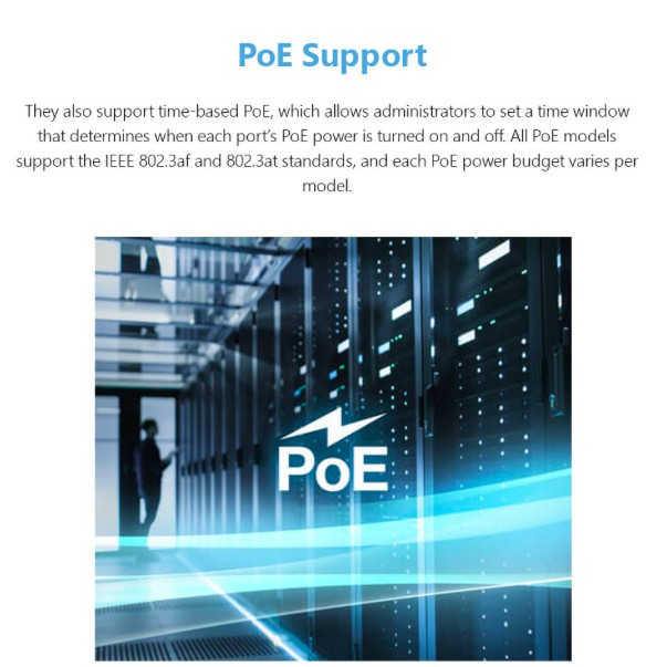 • IEEE 802.3af/at compliance (for PoE ports)