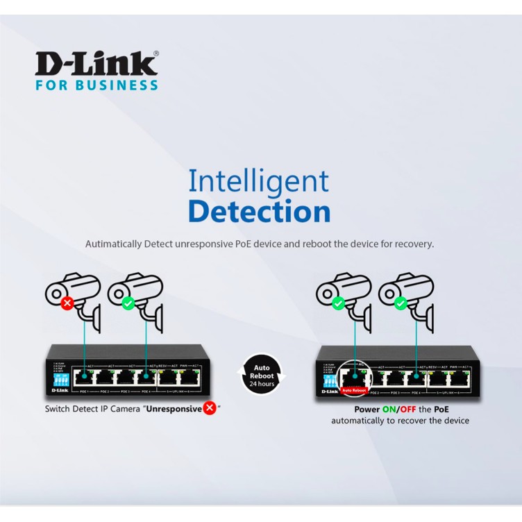 • Hỗ trợ IEEE 802.3at / af Power over Ethernet (PoE) trên các cổng 1 đến 4 cho phép cấp nguồn cho Thiết bị hỗ trợ PoE lên đến 250M