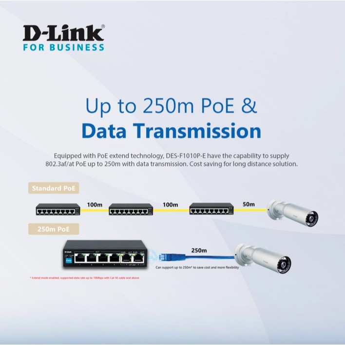 • Có thể được sử dụng với cáp cat5e hoặc cat6. DGS-F1010P-E có bốn cổng 10 / 100BASE-TX hỗ trợ giao thức PoE IEEE 802.3af / at.
