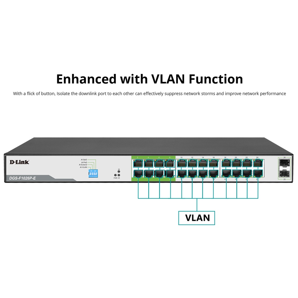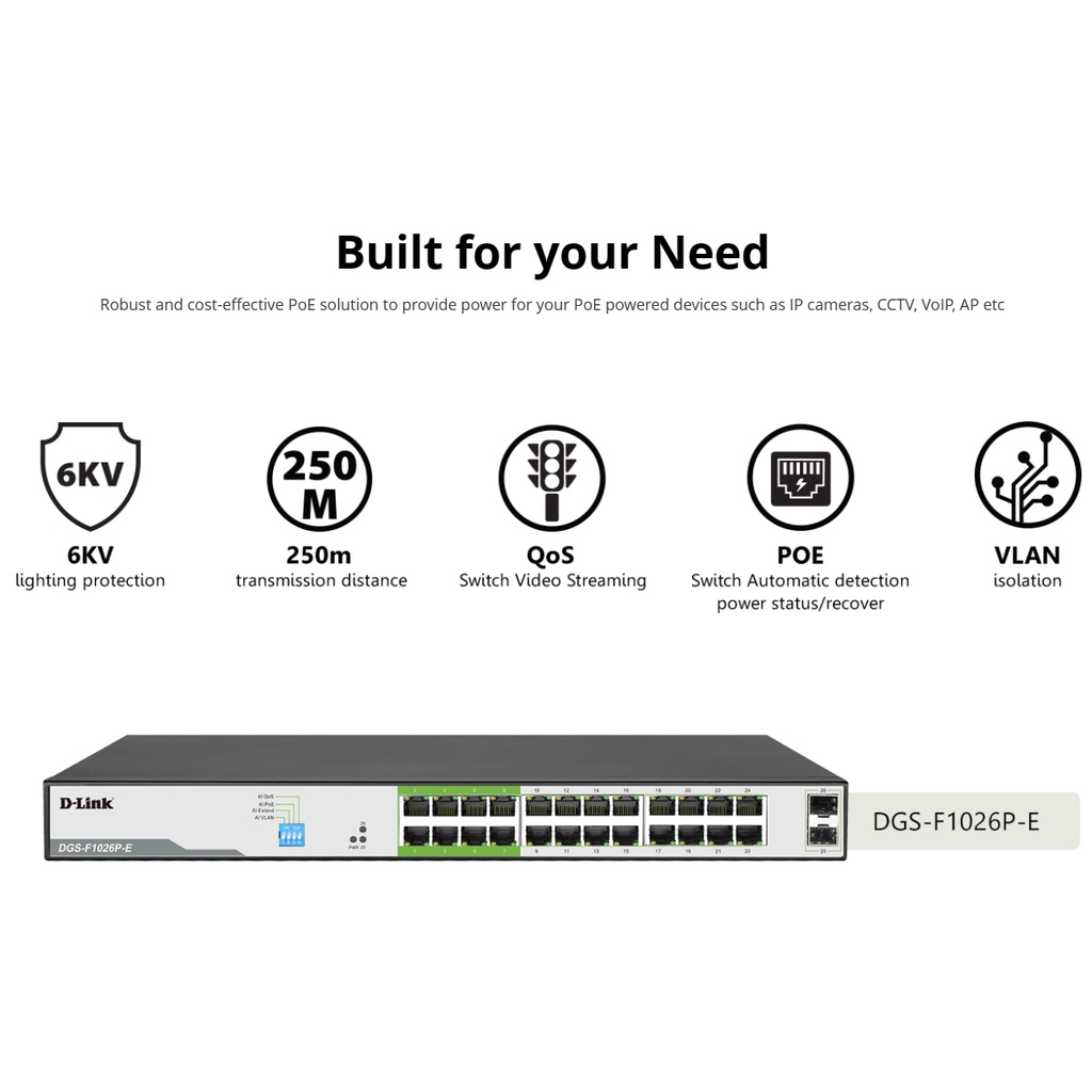D-LINK DGS-F1026P-E - Bộ chia cổng mạng có PoE 250m 24 cổng 1000Mbps với 2 cổng SFP✔✔✔ MÔ TẢ SẢN PHẨM ✔✔✔