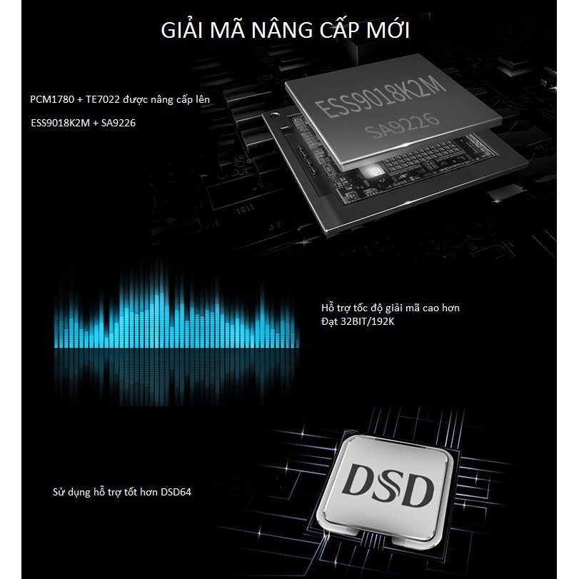 - Giải mã cổng Optical, Coxial và USB: ESS9018K2M hỗ trợ 32bit / 192 KHz