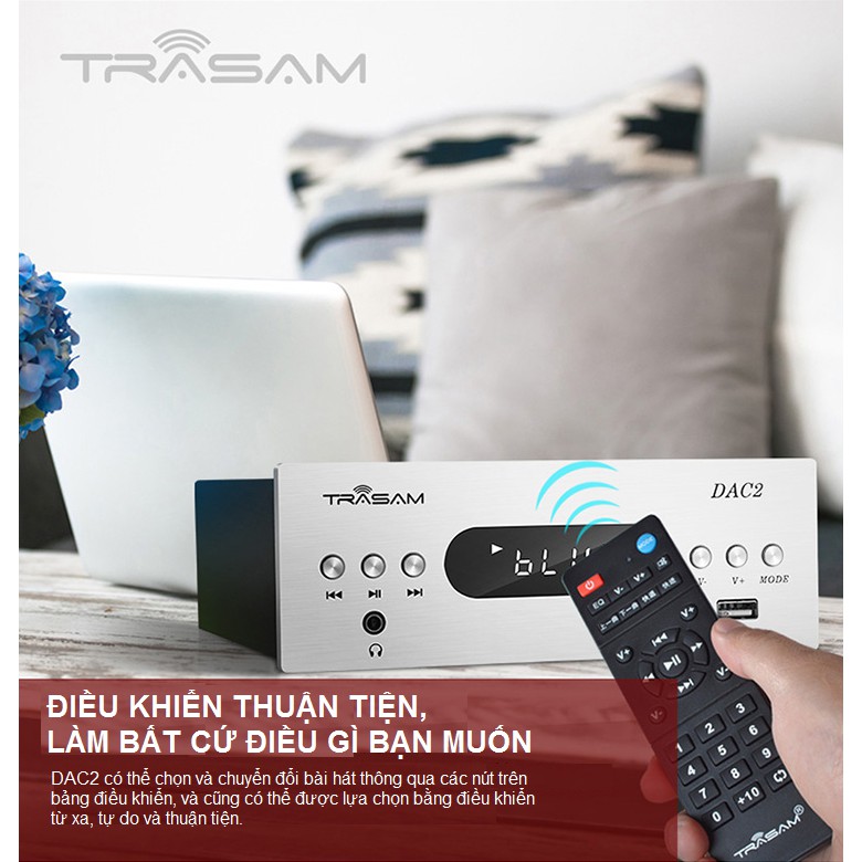 - TRASAM DAC 2PLUS là một DAC nghe nhạc lossless bluetooth chất lượng cao, hỗ trợ đầy đủ các kết nối kỹ thuật số đầu vào như Coxial, USB, Optical và bluetôth. Chuẩn đầu ra RCA hoa sen truyền thống.- DAC 2PLUS là phiên bản nâng cấp của phiên bản DAC-2, cải thiện nguồn điện đầu vào và mạch điện tử, làm cho âm thanh rõ hơn và âm trầm sâu lắng hơn