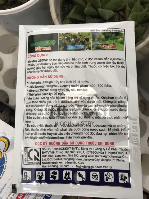 * Cách pha, liều lượng : Các bạn có thể chia nhỏ ra 10g với 8 lít nước hoặc 5g với 4 lít nước, pha đều và phun đủ ướt cây . Cách 1 ngày phun lại 1 lần nữa là ok... Có thể quét trực tiếp lên lá và thân cây