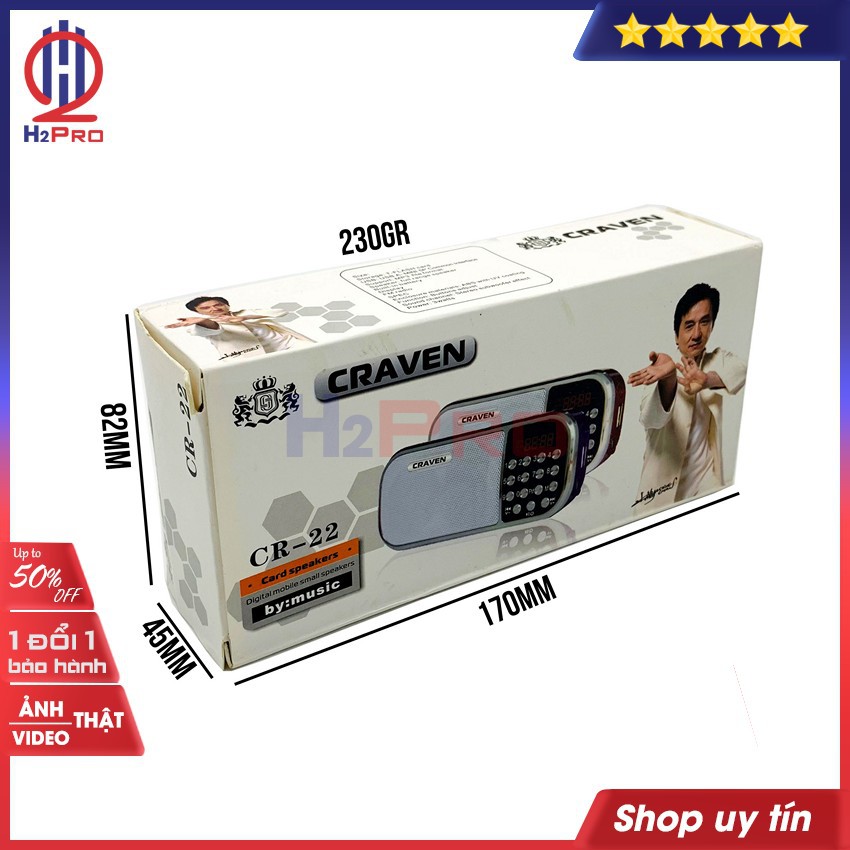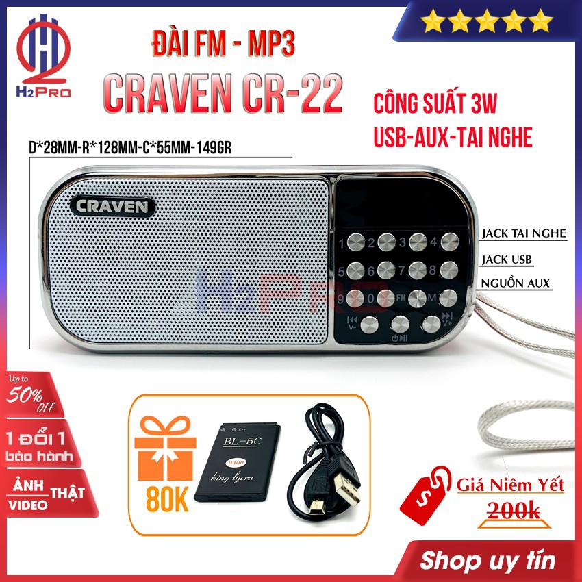 Đài FM-Mp3 CRAVEN CR-22 3W H2Pro USB-Thẻ nhớ-pin sạc BL-5C (1 chiếc),đài radio FM(tặng pin sạc BL-5C và dây sạc giá 80k)