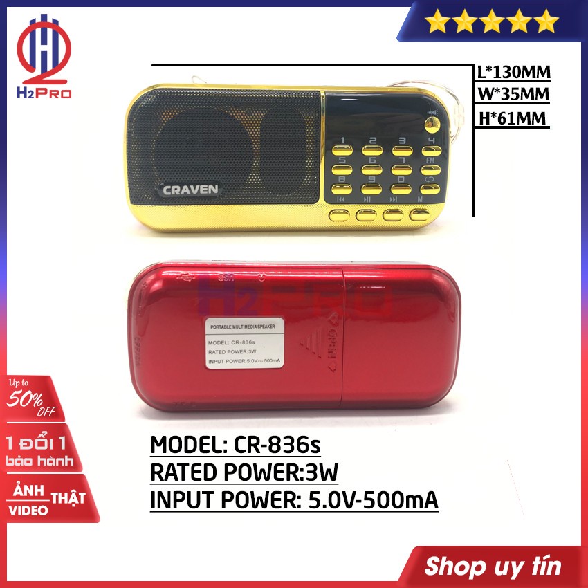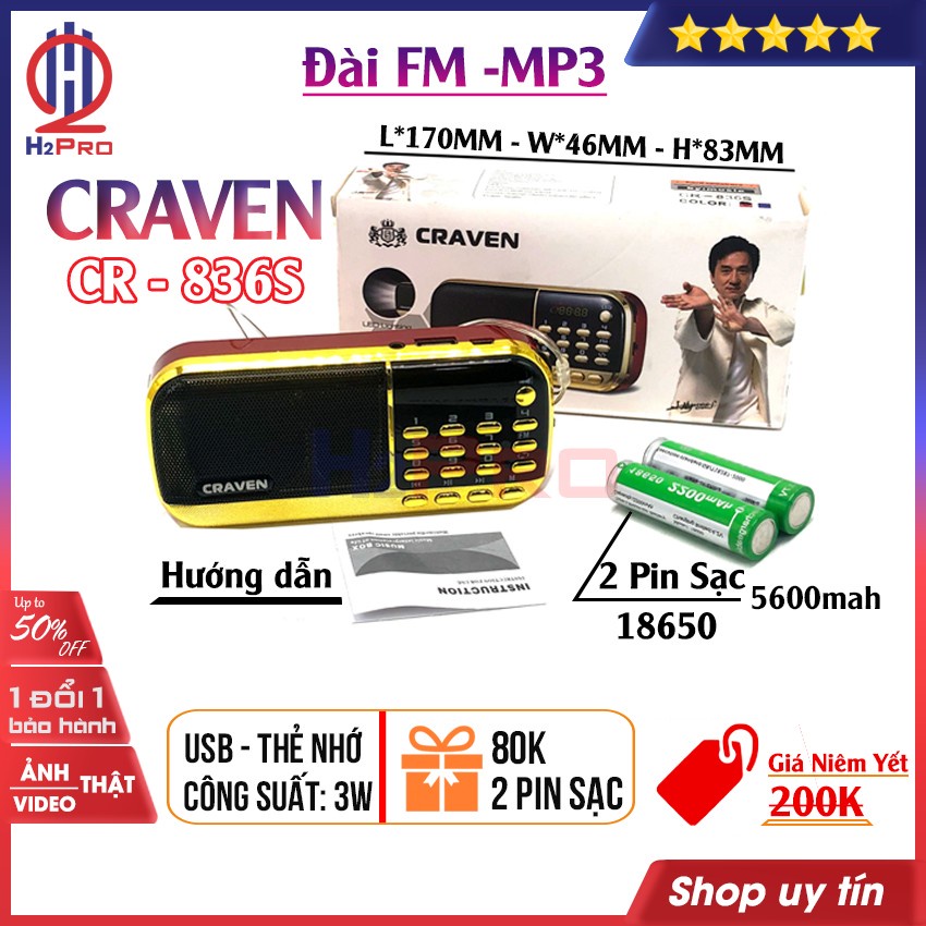 Đài FM-Mp3 CRAVEN CR-836S 3W H2Pro USB-Thẻ nhớ-Đèn pin-loại 2 pin sạc 18650 (1 chiếc), đài radio FM-máy nghe nhạc cao cấp (tặng 2 pin sạc 18650 80k)Đài FM Craven CR-836S bắt được tần số FM, hỗ trợ USB, jack 3.5 kết nối điện thoại, và thiết bị âm thanh khác. Đài fm sử dụng pin sạc điện 18650, tích hợp đèn pin, dễ dàng mang theo bên mình nhờ vào tay cầm chắc chắn như máy nghe nhạc. Đài radio CR-836S đang được Thế giới công nghệ H2Pro phân phối và bán lẻ, giao hàng toàn quốc.