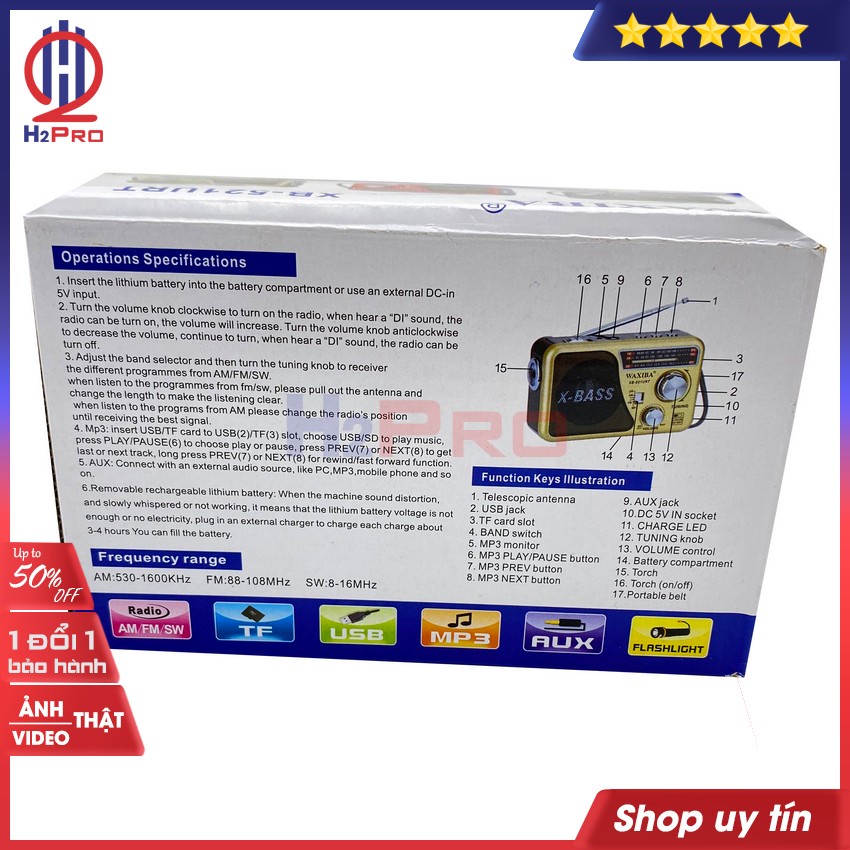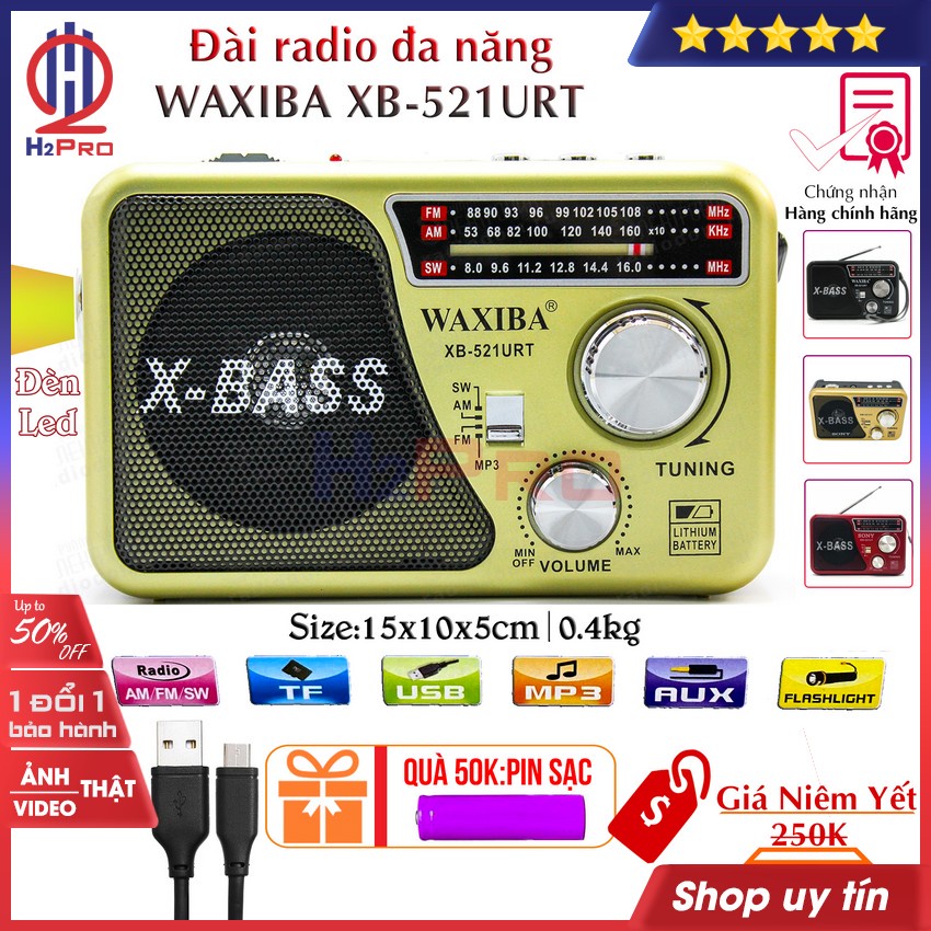 ĐÀI RADIO FM-AM-SW WAXIBA XB-521URT H2Pro nghe nhạc MP3 USB-Thẻ nhớ-AUX, đài radio đa năng pin sạc tích hợp ĐÈN PIN (Quà 50k:pin sạc 18650)Đài radio Waxiba XB-521URT là một món quà ý nghĩa dành cho ông bà. Ngoài chức năng radio 3 bands FM-AM-SW máy còn đa năng tích hợp thêm đèn pin, nghe nhạc tiện dụng qua usb-thẻ nhớ-aux, sử dụng pin sạc tiện dụng đỡ phải thay pin nhiều lần. Nhờ những tính năng đặc biệt trên, đi kèm chất lượng cao cấp tới từ hãng WAXIBA giúp sản phẩm trở thành một món ăn tinh thần tiện dùng mới người lớn tuổi. Đài radio đa năng WAXIBA XB-521URT đang được thế giới công nghệ H2pro phân phối và bán lẻ trên toàn quốc.