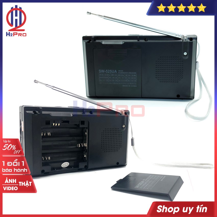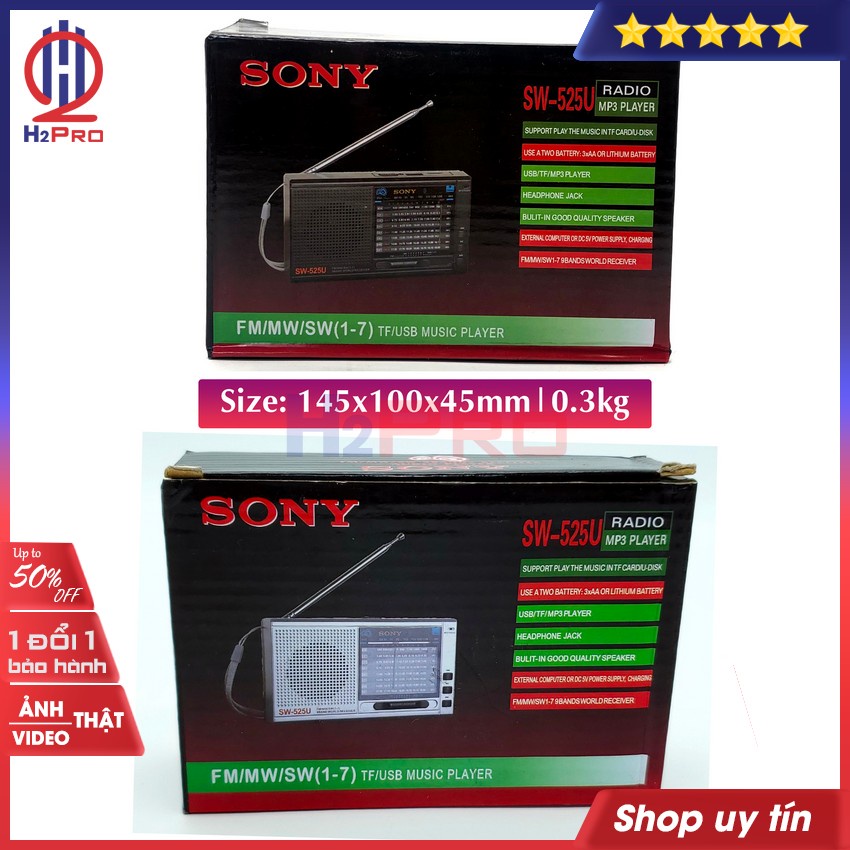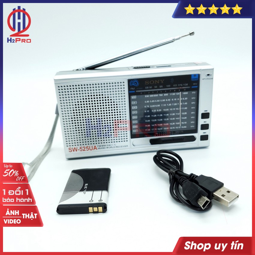 Đài radio FM Sony SW-525UA H2Pro 9 Bands Quốc tế FM, MW, SW1-7, đài radio sạc điện, có USB-Thẻ nhớ làm máy nghe nhạc mp3 (tặng pin sạc và dây sạc 79K)Đài FM Sony SW-525UA bắt được 9 tần số FM/MW/SW1-7, hỗ trợ USB/thẻ nhớ, jack 3.5 kết nối điện thoại, và thiết bị âm thanh khác. Đài fm sử dụng pin sạc điện nokia, dễ dàng mang theo bên mình nhờ vào tay cầm chắc chắn như máy nghe nhạc. Đài radio SW-525UA đang được Thế giới công nghệ H2Pro phân phối và bán lẻ, giao hàng toàn quốc.